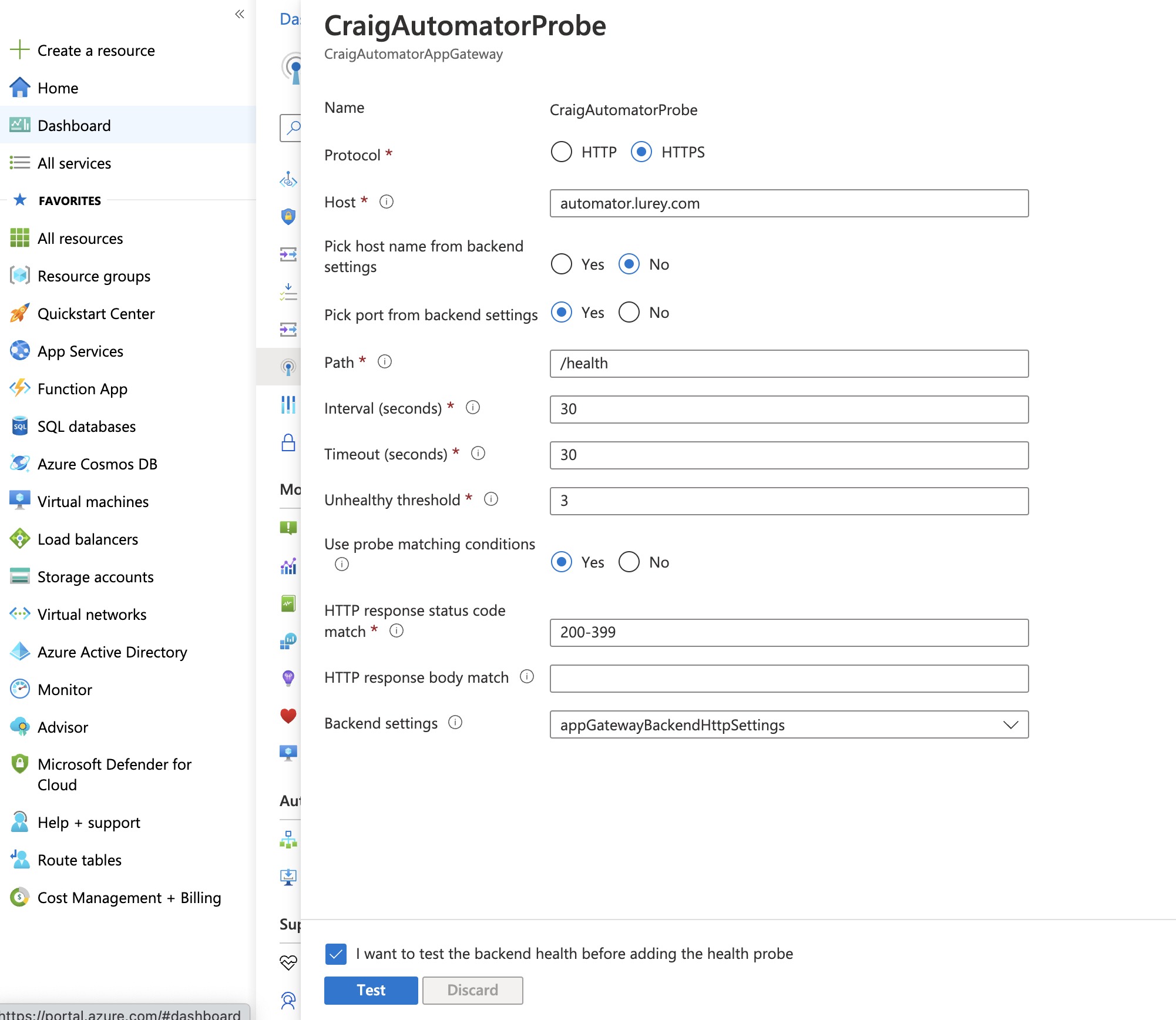 Now create a new Health Probe with the settings as seen in the below screenshot. Make sure to replace the Host with the FQDN set up in Step 16.