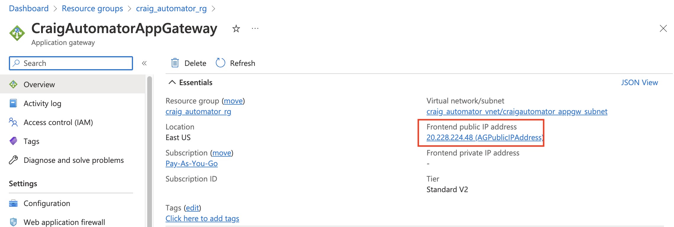 In the Azure portal interface, navigate to the Resource Group > App Gateway and make note of the public IP address.