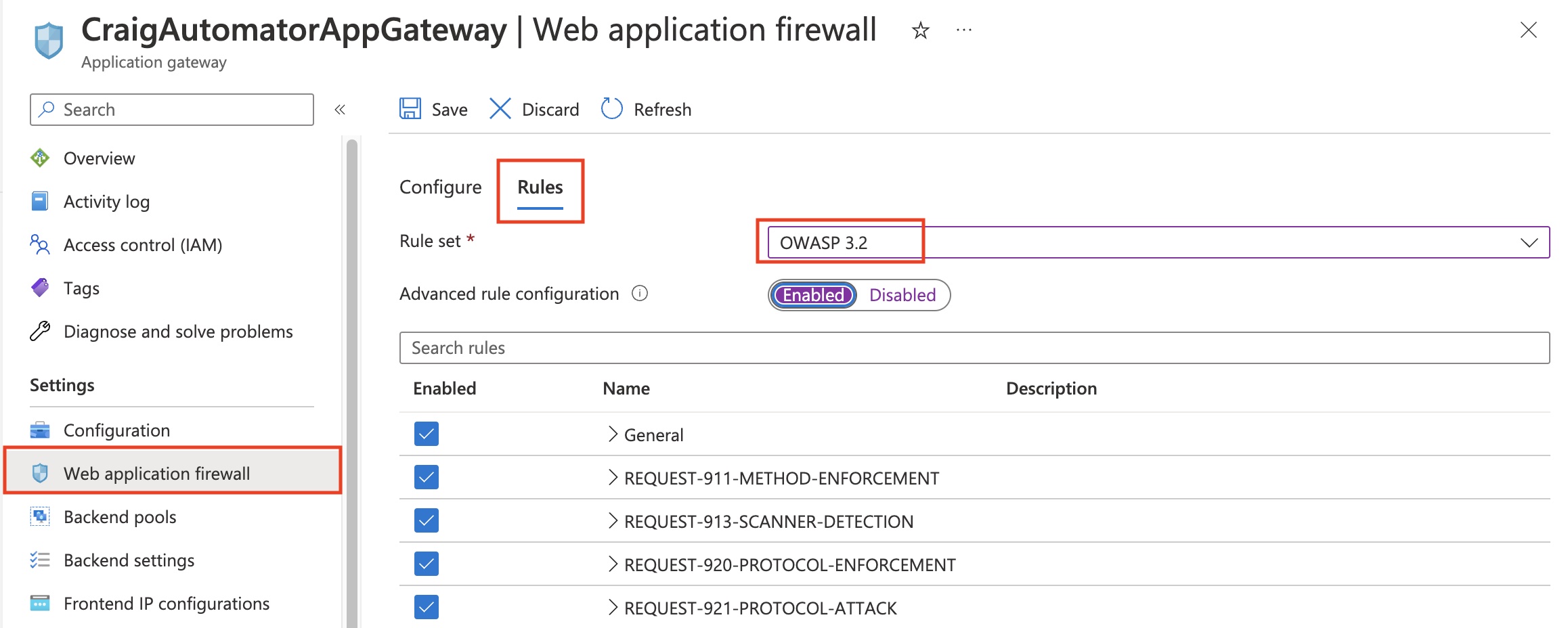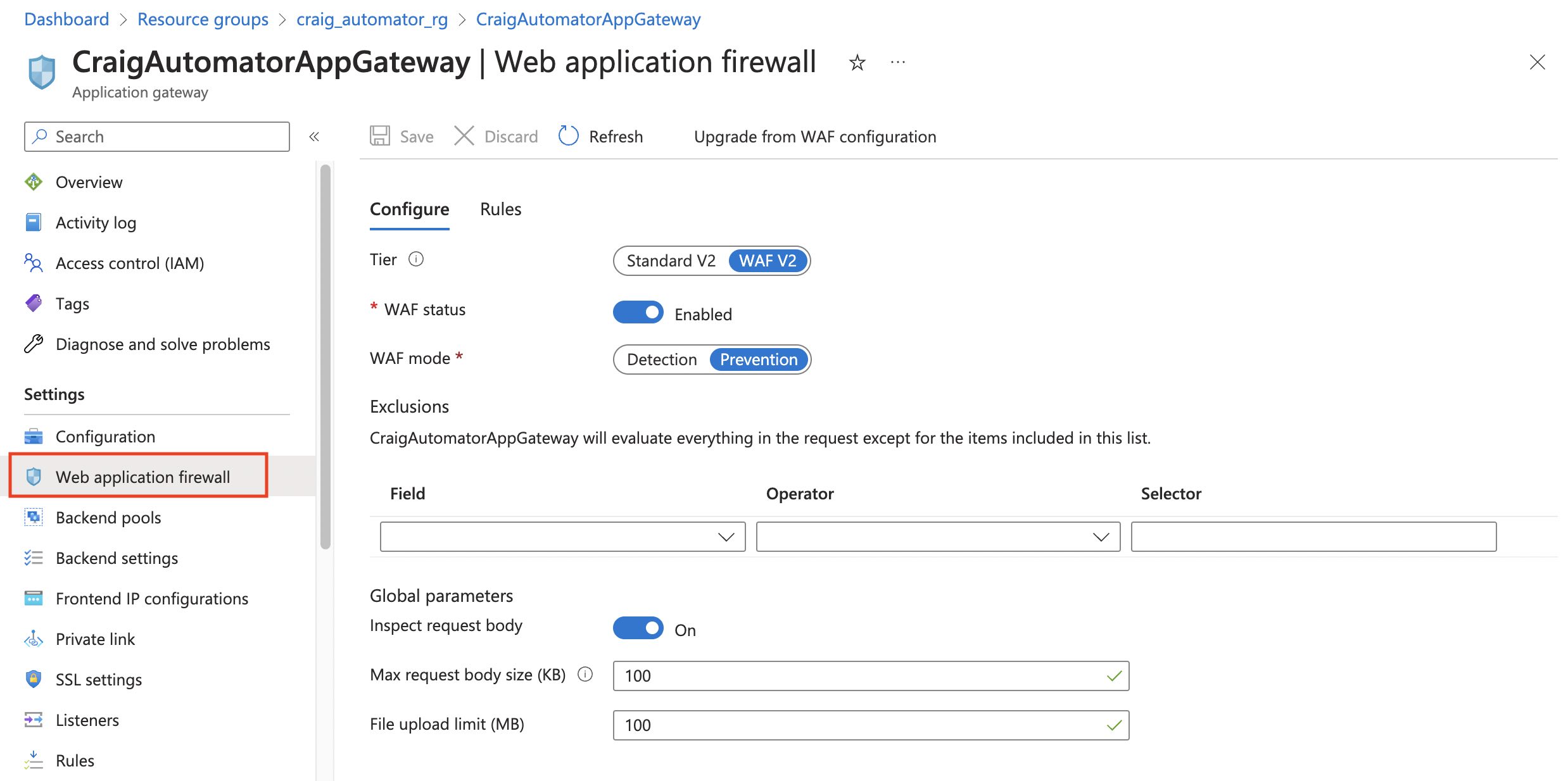 From the Azure portal interface, open the Automator App Gateway and then click on "Web application firewall" on the left side. Enable the WAF V2 and configure the screen exactly as seen below.
