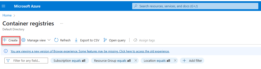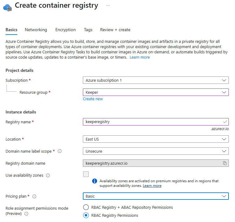 If you do not already have a container registry, you must create one and configure as you see fit. Example below.