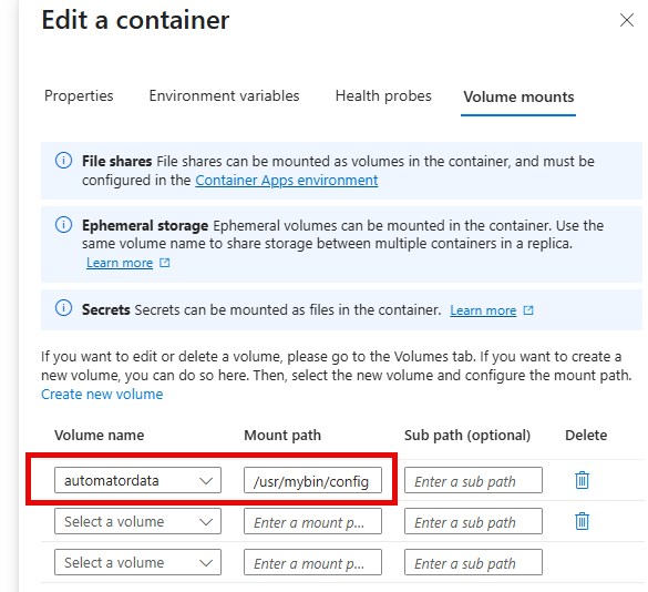 * Select the volume you created in a previous step and Add Mount Path as **`/usr/mybin/config`**