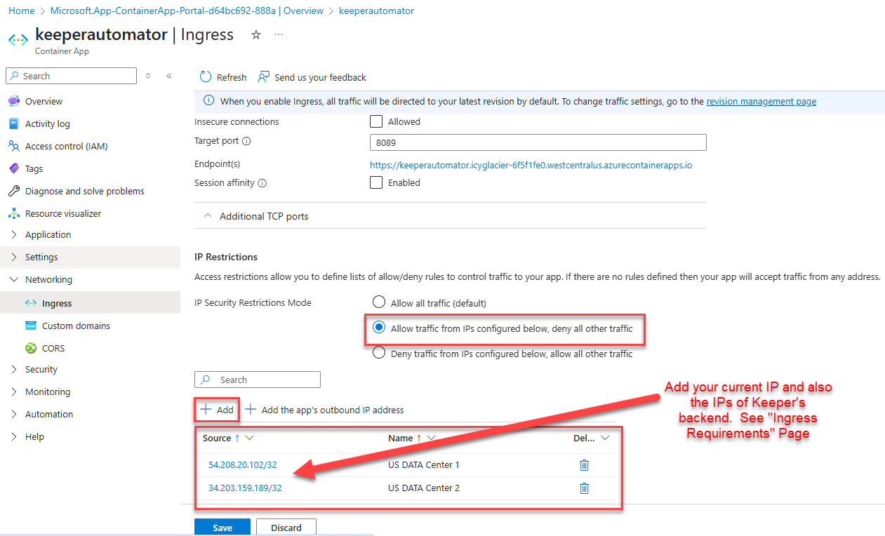 * Click "**Add**" to add [two of Keeper's IPs](https://docs.keeper.io/en/sso-connect-cloud/device-approvals/automator/ingress-requirements) and any of your IPs required for testing the service. Ingress Requirements information: [Located Here](https://docs.keeper.io/en/sso-connect-cloud/device-approvals/automator/ingress-requirements)