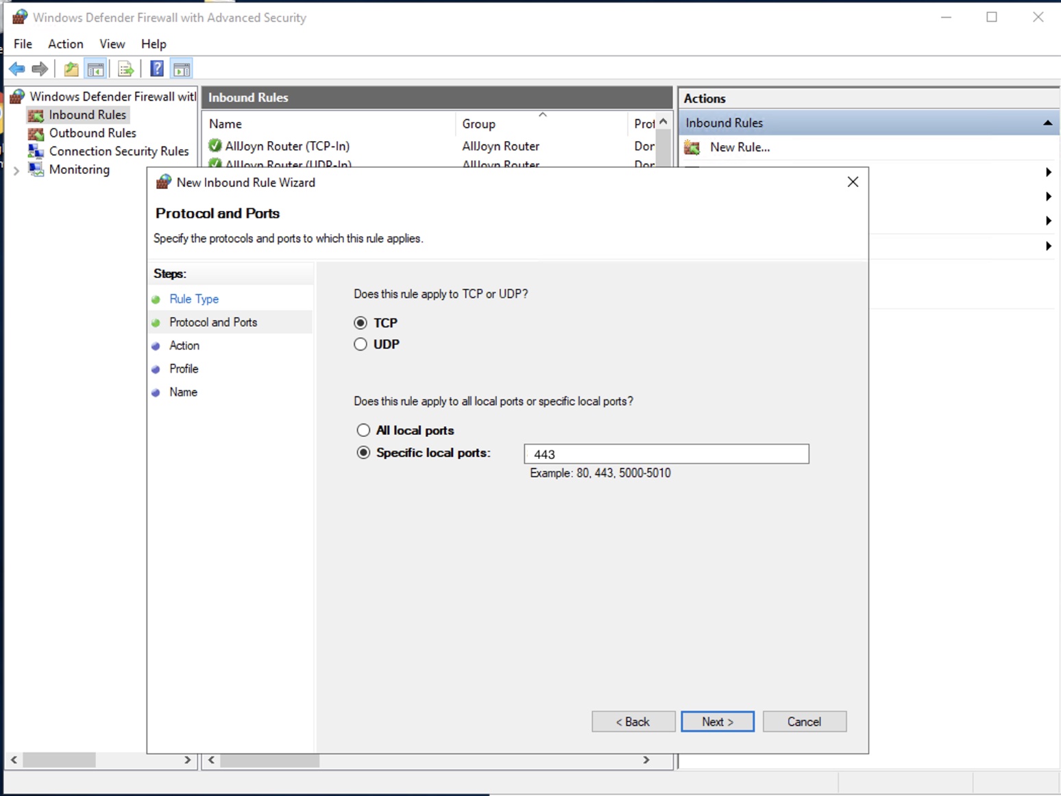 If you are deploying on Windows running Defender Firewall, most likely you will need to open port 443 (or whatever port you specified) on Windows Defender Firewall. Follow these steps: