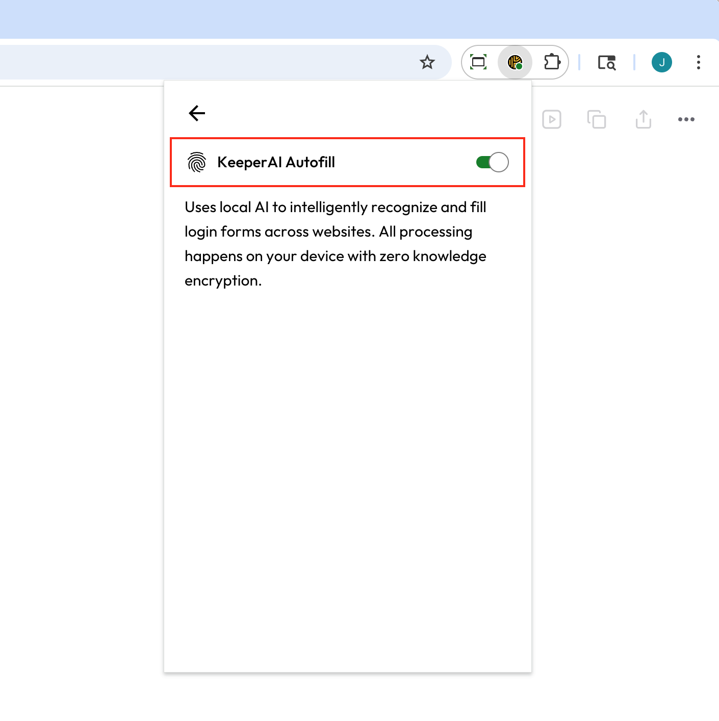 To activate KeeperAI Autofill, navigate to your extension **Settings**, select **KeeperAI Autofill** then toggle the feature on.