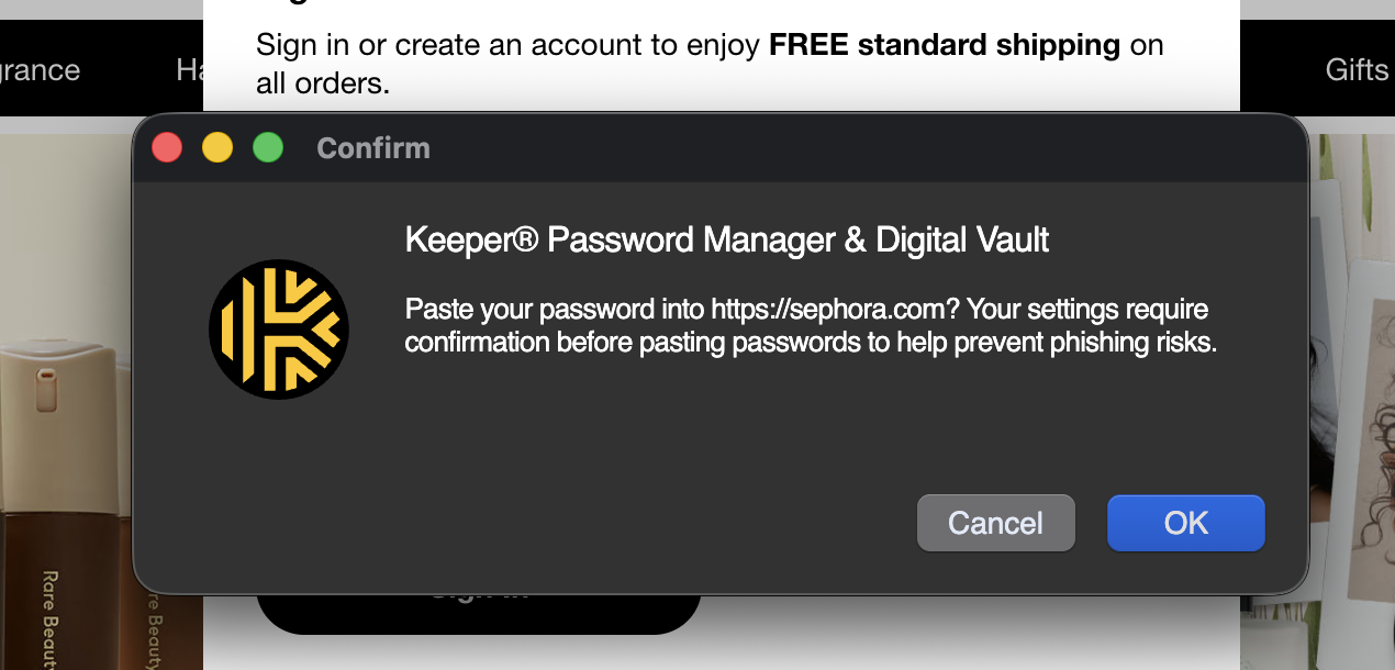 When Verify Mode is enabled, pasting a password into a login form triggers an instant check against the records in your vault. If the site doesn't match a record, you'll receive a real-time warning before anything is submitted, showing which site triggered the alert, with the option to proceed or cancel. This security setting protects against phishing and accidental exposure.&#x20;