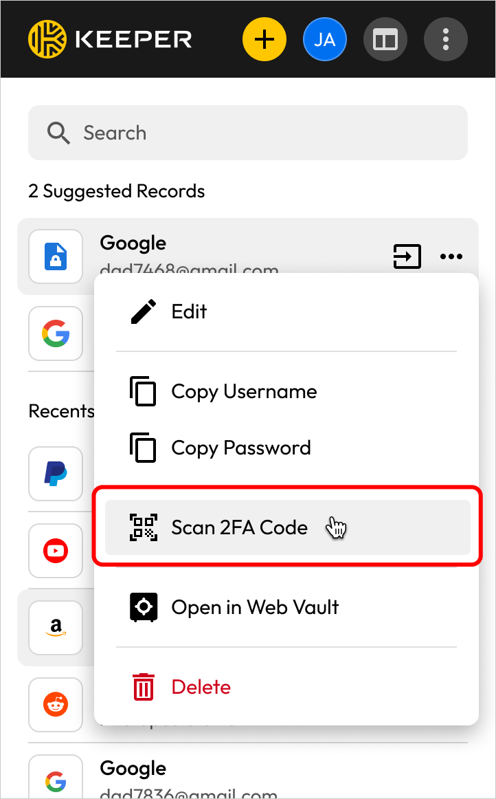 <figure><img src="https://914511346-files.gitbook.io/~/files/v0/b/gitbook-x-prod.appspot.com/o/spaces%2F-LSGVtOTYUIkVBoYtFvK%2Fuploads%2FHwyUC0xzGEcsuyz57vPP%2FSide%20Panel%20-%20Single%20record%20suggestion%402x.png?alt=media&#x26;token=e7659cfd-2bc6-4a1f-8033-0c731311a763" alt=""><figcaption><p>Add Scanned 2FA Code to Record</p></figcaption></figure>