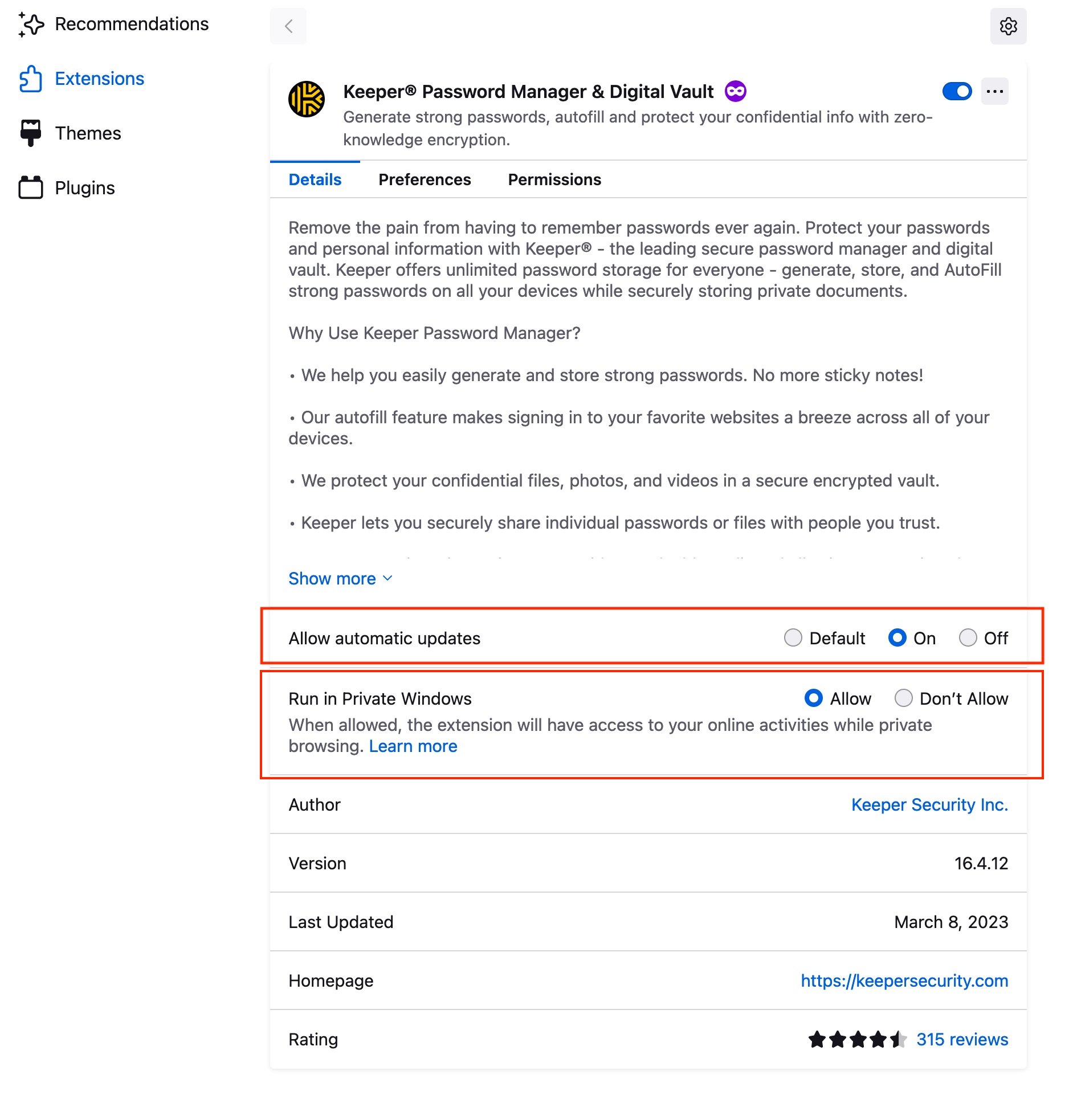 To ensure you are using the latest version of KeeperFill and allow Keeper to run in private windows, enable both of these settings (pictured below) from the Keeper extension menu. Right-click on the Keeper extension icon in the upper-right corner of your browser window and select "Manager Extension".