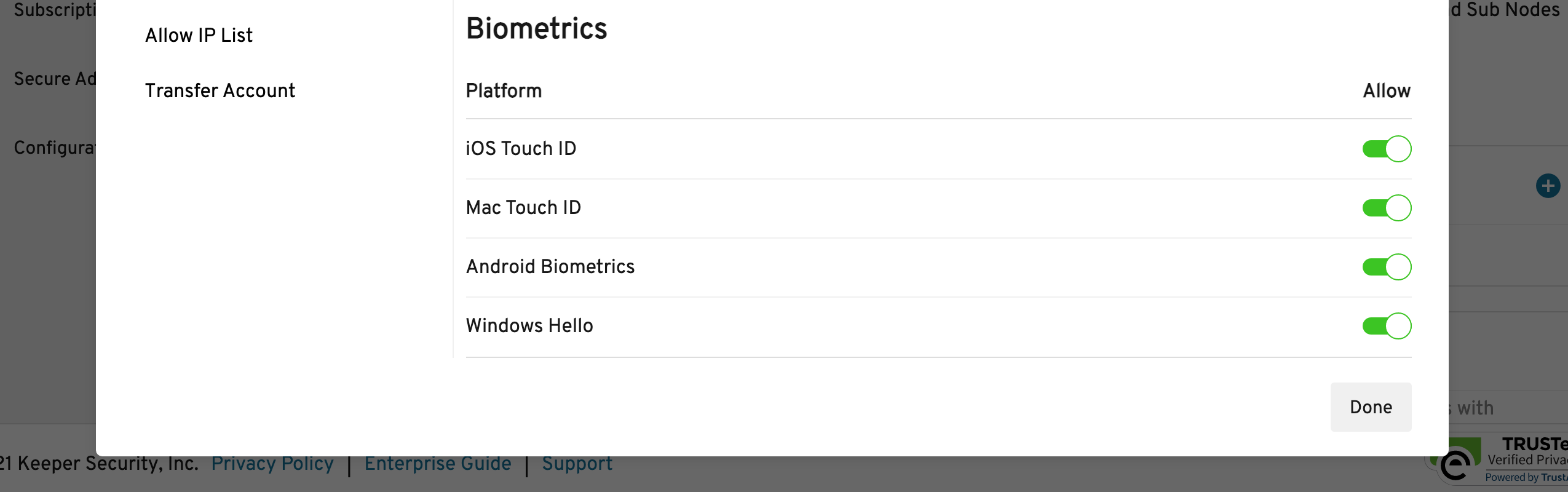 Keeper natively supports Windows Hello, Touch ID, Face ID and Android biometrics. Customers who normally login to their Keeper Vault using a Master Password or Enterprise SSO Login can also login to their devices using a biometric. Offline access can also be achieved with a biometric for both Master Password and SSO-enabled users unless the "Restrict offline access" enforcement is applied in the Account Settings policy screen.