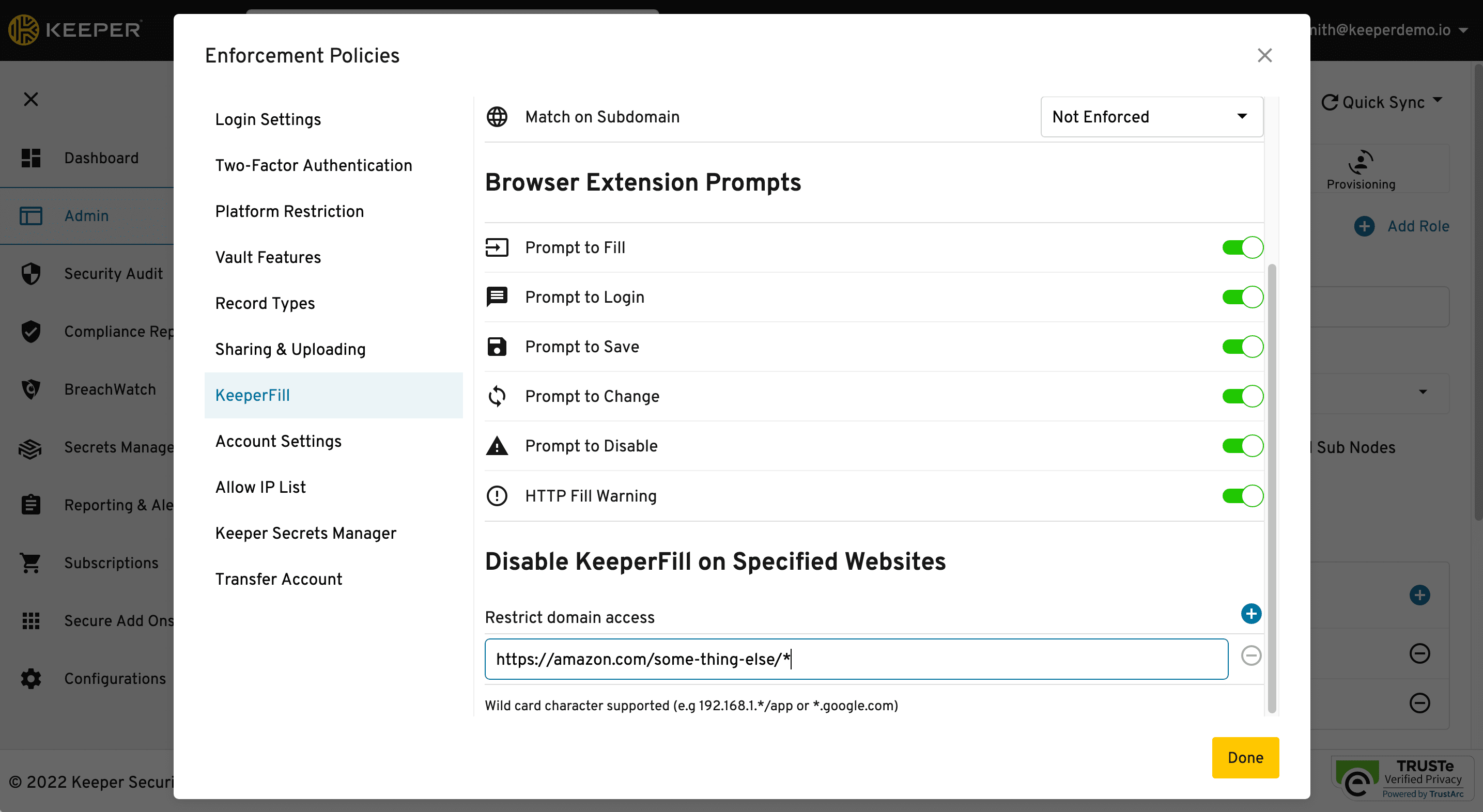 Admins can disable KeeperFill on specific websites. This feature supports wildcard characters for matching domain names or URLs. One use case might be to disable KeeperFill for internal applications that have a lot of form fields.