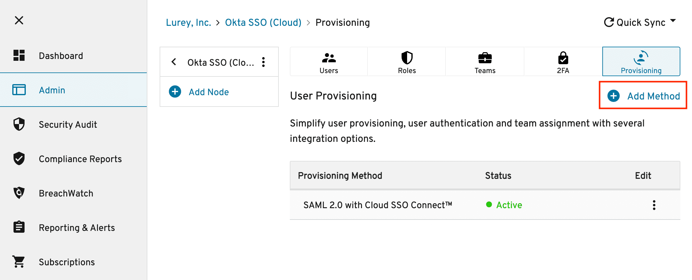 Open the Keeper Admin Console and navigate to a node which should be synchronized with your Okta account. If you are using SAML 2.0 authentication, add the SCIM connector to the same node. Select Add Method > SCIM (System for Cross-Domain Identity Management) and click Next.