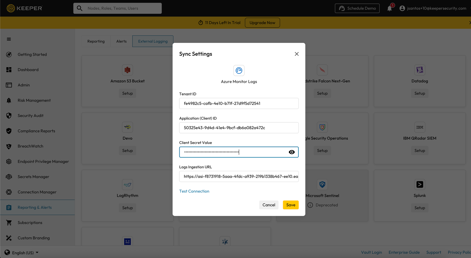 **Keeper管理コンソールのレポートとアラート画面でAzure Monitor Logs**に移動し、手順7で取得した情報を入力します。