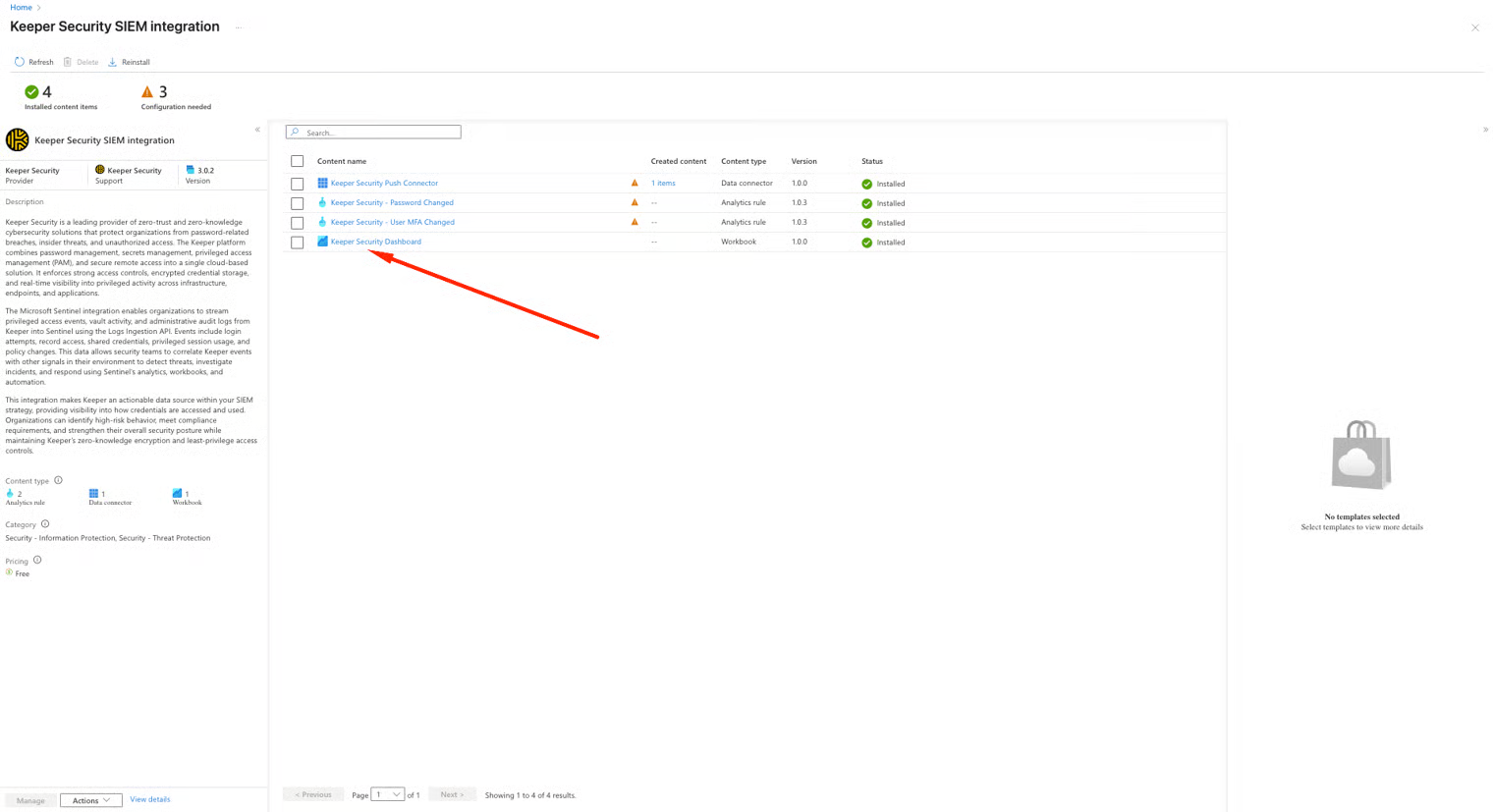 * Microsoft Sentinelで、**\[コンテンツ ハブ]** → **\[Keeper Security SIEM Integration]** に移動します。