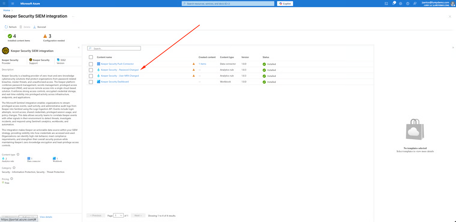 * インストール済みコンテンツ項目の下にある **\[Keeper Security – Password Changed (分析ルール)]**  を探します。