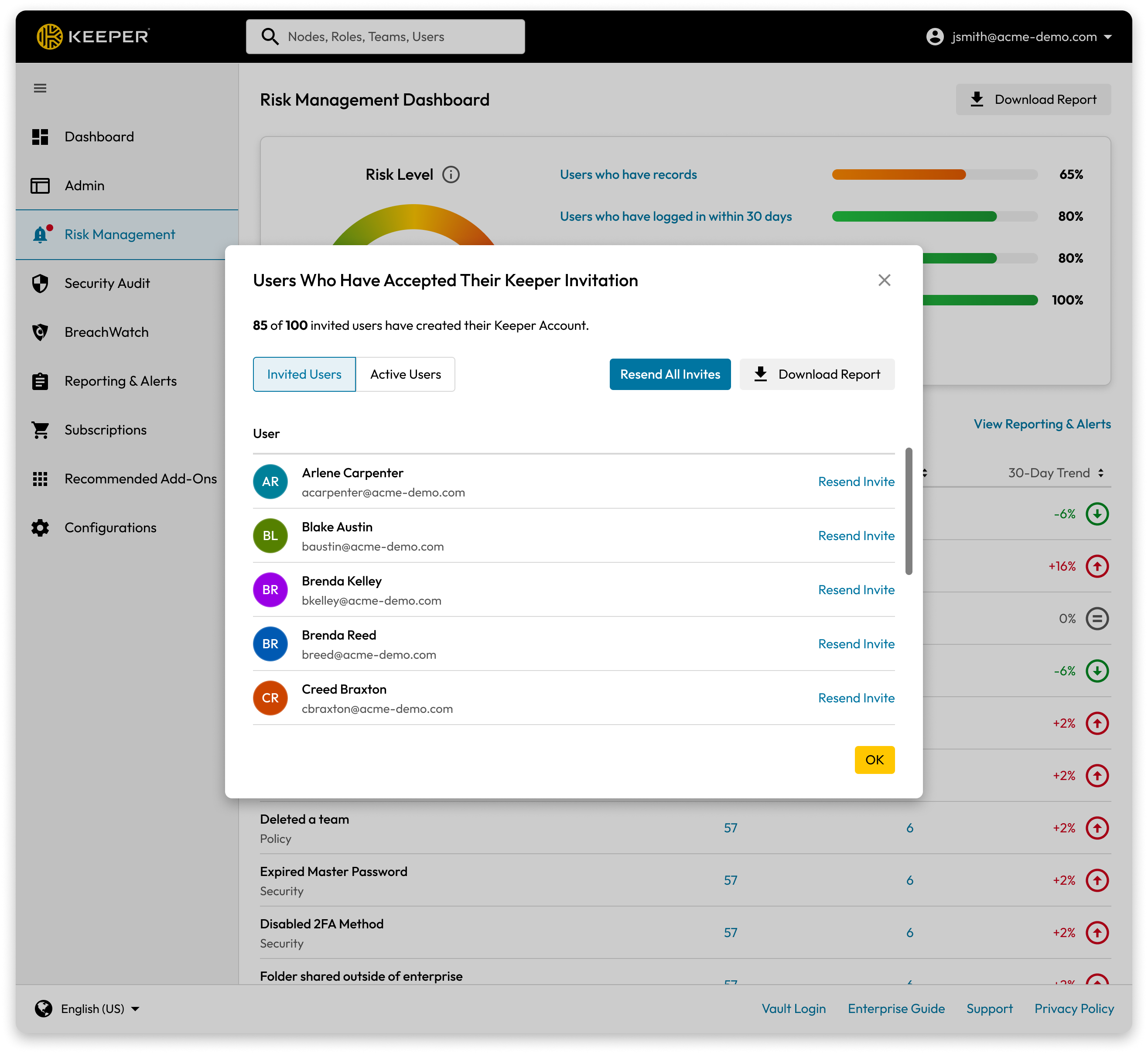 **「Keeperへの招待を受諾したユーザー」**&#x306F;、Keeperへの招待を受諾したユーザーに関する指標です。また、招待を受諾していないユーザーには招待を再送信することもできるので、組織内でのKeeper使用率を上げるのにも有効です。