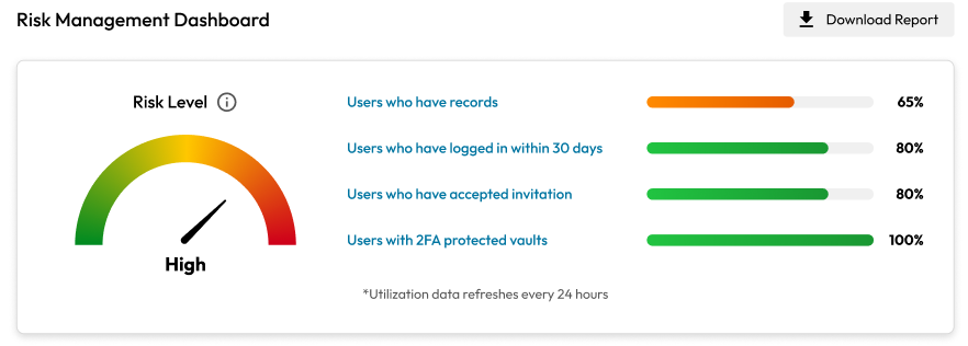リスク管理ダッシュボードでは、 [Keeperセキュリティ指標](https://docs.keeper.io/enterprise-guide/recommended-security-settings)を活用して組織のコンプライアンスと安全を確保します。最小権限の原則を適用し、最高レベルのセキュリティを導入できるよう、Keeperではこれらのベンチマークを定期的に更新することで、セキュリティの導入を簡素化するとともに、管理者に重要な情報をお届けします。