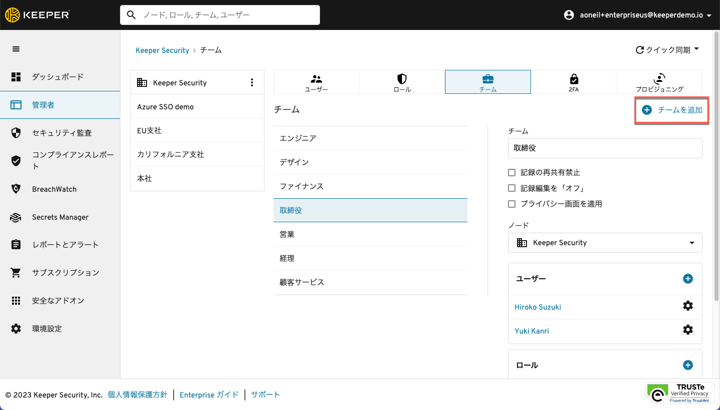 **\[チーム]**&#x30BF;ブから、編集したいチームを選択します。ここから、名前の変更、レコードの再共有の禁止、レコードの編集の禁止、プライバシー画面の適用などを設定できます。チームが属するノードを変更したり、チームにユーザーやロールを追加することもできます。チームを削除するに&#x306F;**\[オプション]**&#x304B;&#x3089;**\[削除]**&#x3092;クリックします。