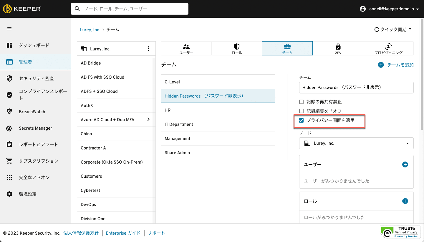 プライバシー画面は、Keeperのロール強制適用ポリシーでロール単位およびウェブサイトのドメイン単位で設定することもできます。
