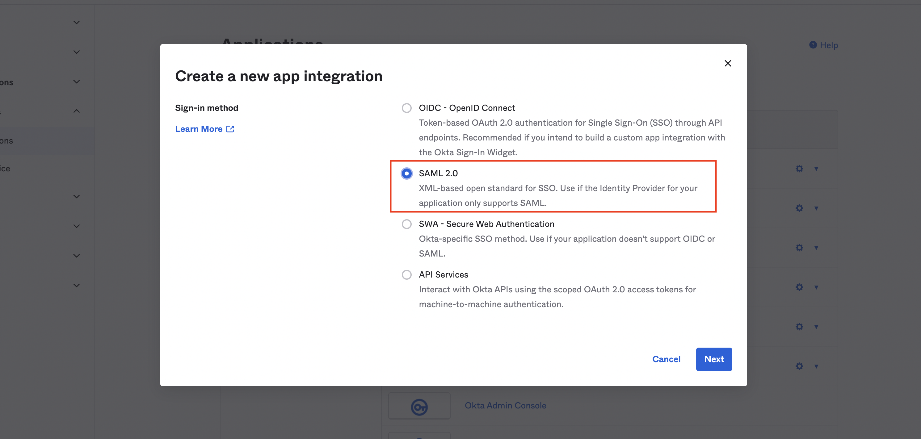 **(1)** Oktaで、**Admin** (管理者) > **Applications** (アプリケーション) > **Create App Integration** (アプリ統合の作成) に移動し、**SAML 2.0**を選択し、\[Next] (次へ) をクリックします。