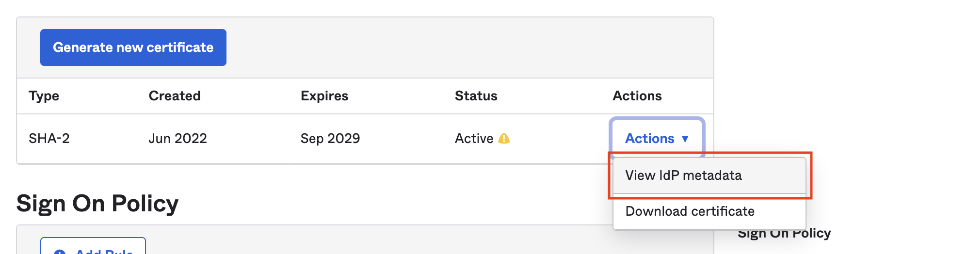このメタデータXMLファイルは、Actions (アクション) の下のSign On (サインオン) タブ > SAML Signing Certificate (SAML署名証明書) で関連付けることもできます。