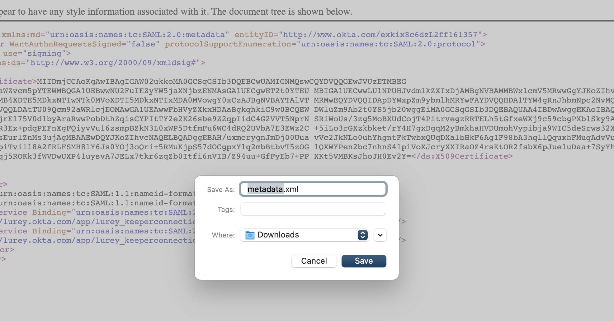 **(6)** Oktaメタデータファイルをダウンロードし、ローカルマシンに**metadata.xml**として保存します。