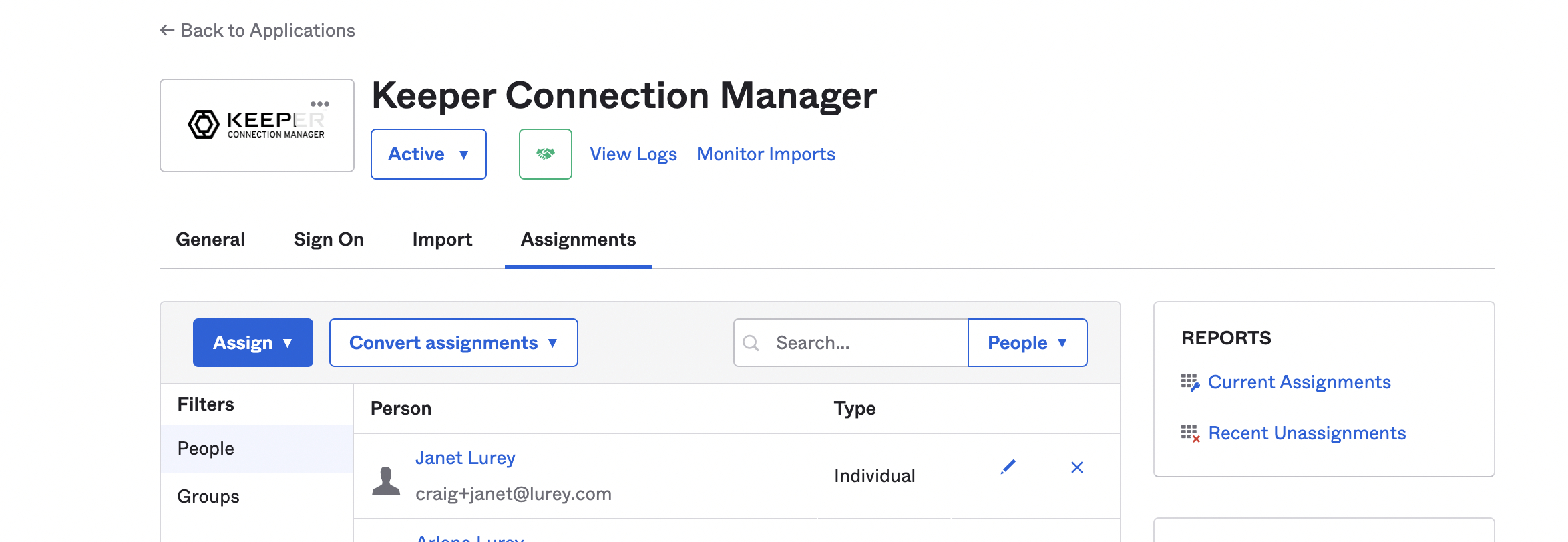**(5)** SAML接続アプリの通常の操作と同様に、ユーザーやグループをKeeper Connection Managerアプリケーションに割り当てます。