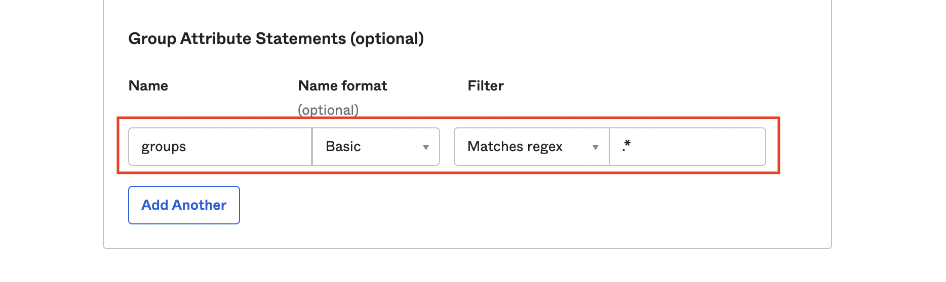 「Group Attribute Statements」 (グループ属性ステートメント) まで下にスクロールします。グループ属性を送信するには、名前を「`groups`」に設定し、名前の形式を「`Basic`」に設定します。ユーザーに割り当てられたすべてのグループをKeeper Connection Managerに送信したい場合は、「`Matches regex`」の値に「`.*`」を選択します。