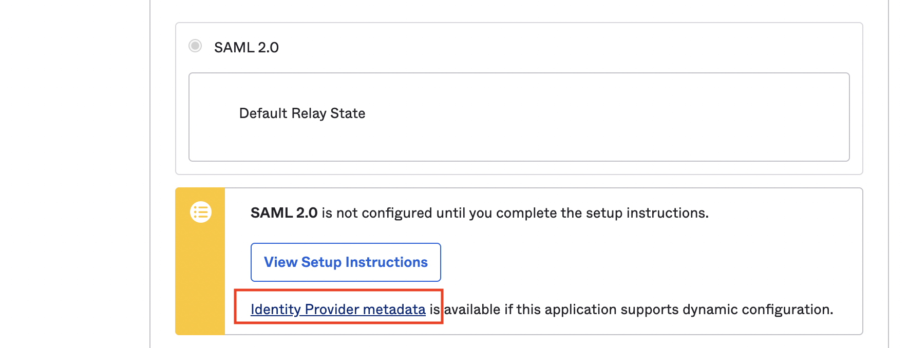 メタデータファイルの場所は、Oktaインターフェースのバージョンによって異なります。この例では、アプリケーションページに「Identity Provider metadata」 (IDプロバイダのメタデータ) というリンクがあります。また、メタデータが表示されたテキストボックスが開いて、コンピュータ上のローカルファイルに貼り付けられる場合もあります。