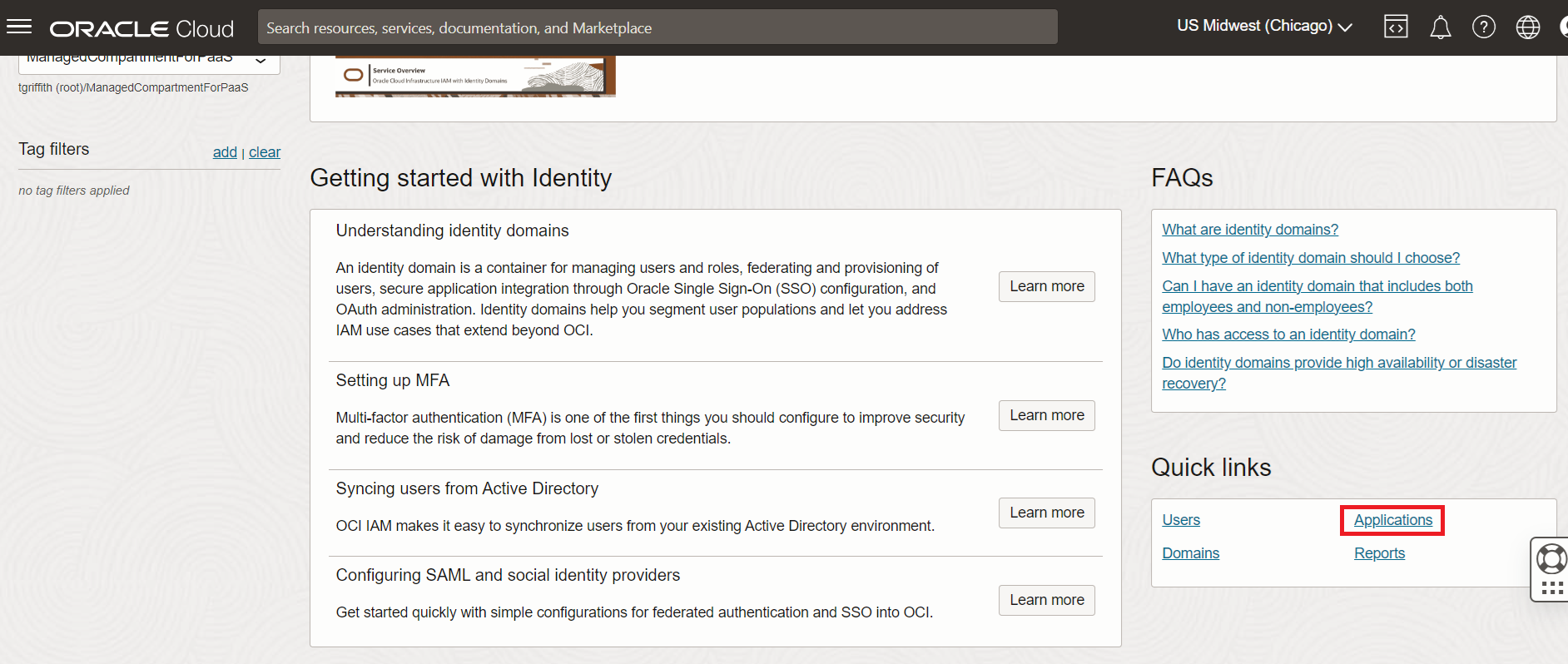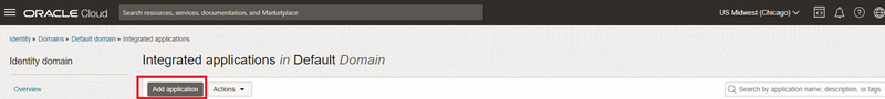 Oracle Admin Consoleを開いて、Identity Domains Overviewのページへ移動して[Applications]を選択します。