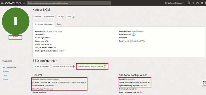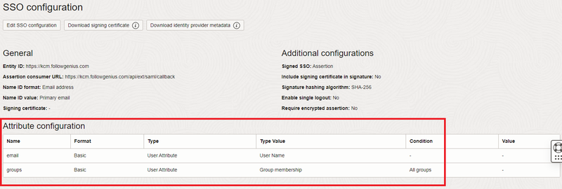 セキュリティ態勢に応じて、[Application Information]に適切な設定を適用します。[Edit SSO Configuration]をクリックします。Metadataをダウンロードし、ファイル名をmetadata.xmlに変更します。Entity IDをhttps://kcm.somedomain.comなどコネクションマネージャーサーバーのURLに設定します。Assertion Consumer URLには、ドメインURLの末尾に/api/ext/saml/callbackを追加します (例: https://kcm.somedomain.com/api/ext/saml/callback)。