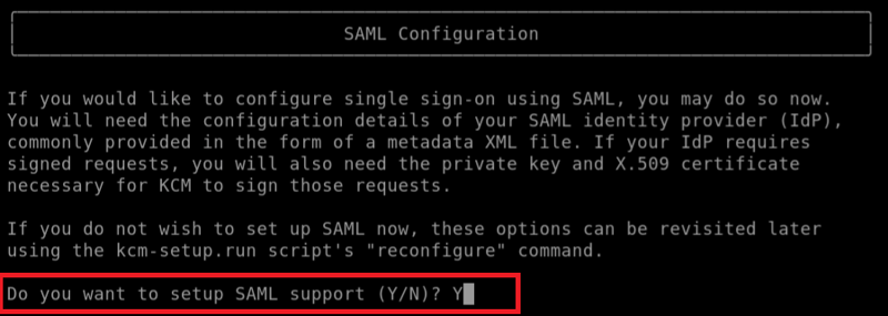 [Do you want to setup SAML support (Y/N)?]に対して「Y」と答えます。