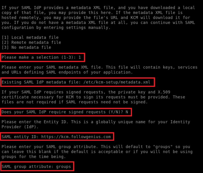 ローカルメタデータファイルの1を選択します。次に、メタデータファイルのパスとして/etc/kcm-setup/metadata.xmlと入力し、Enterキーを押します。