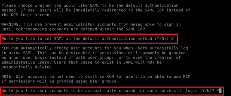 デフォルトの認証方法に関して、セキュリティ態勢に最も適した設定を選択します。ユーザーのジャストインタイムプロビジョニングが必要な場合は、[Would you like user accounts to be automatically created for each successful login (Y/N)?]という質問に「Y」と答えます。