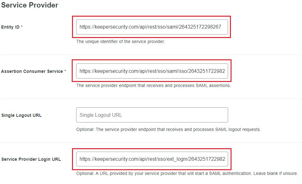 引き続き、Keeper管理コンソール内のDUOクラウドSSOコネクトのプロビジョニングメソッドで、**編集ビュー**を終了して、**\[表示]**&#x3092;選択します。 サービスプロバイダセクション内に、**\[エンティティID]**、**\[IDP起点ログインエンドポイント]**、**\[アサーションコンシューマーサービス (ACS) エンドポイント]**&#x306E;メタデータの値が表示されます。
