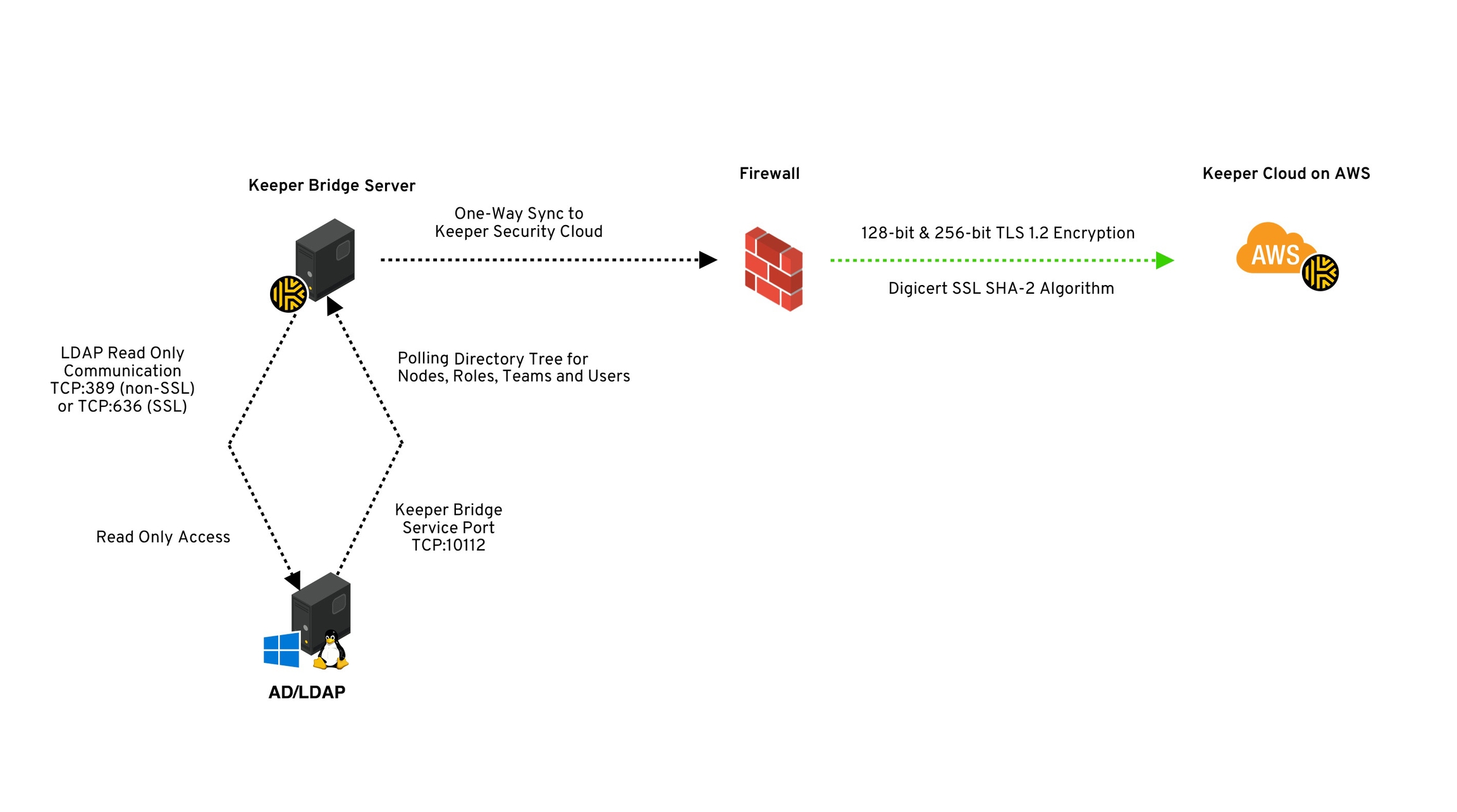 Windowsサービスは、ノード、ロール、チーム、ユーザーのディレクトリツリーをポーリングし、これらの要素をKeeper管理コンソールと同期させます。これにより、ユーザー、ロール、チームの管理が簡素化され、ユーザーへの招待が自動で行われます。ポーリング間隔は5分から1440分の範囲で設定可能です。