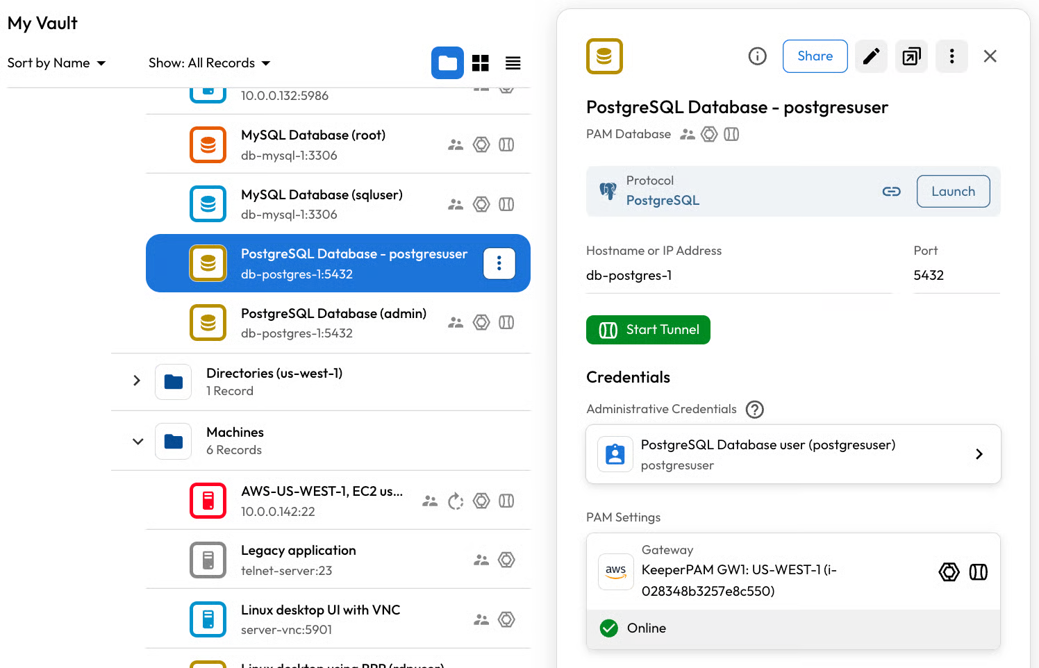 PostgreSQLデータベースレコードのセットアップが完了しました。接続の起動権限が付与されているユーザーは、ボルトからPostgreSQL接続またはトンネル接続を起動できます。