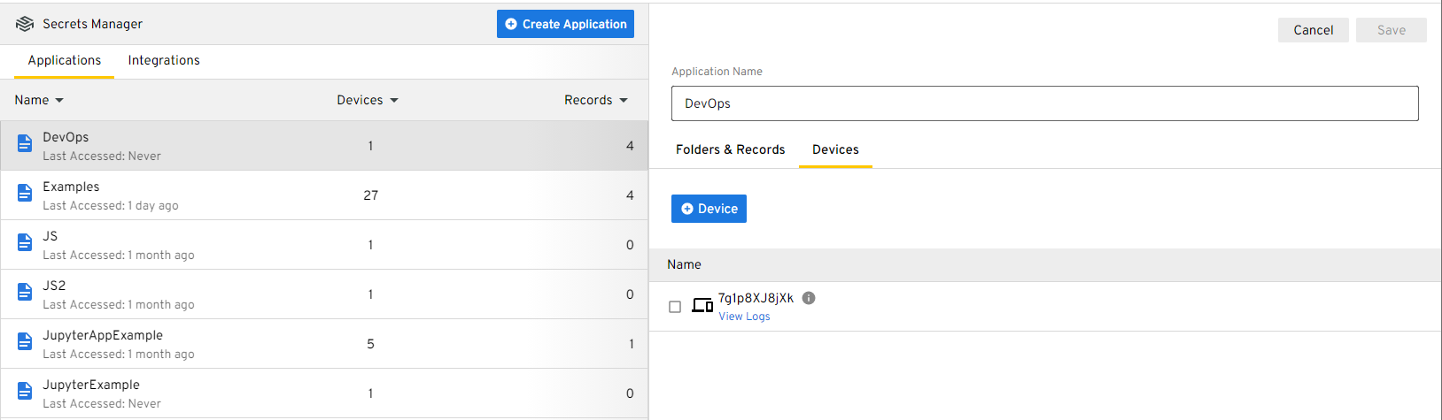 既存のシークレットマネージャーアプリケーションで新しいクライアントデバイスを作成し、新しいワンタイムアクセストークンを生成するには、まずシークレットマネージャーのタブに表示されている一覧から使用するアプリケーションを選択します。