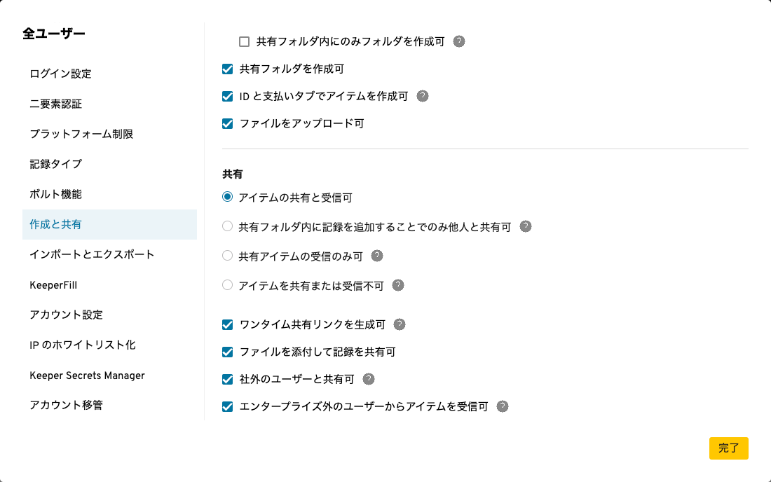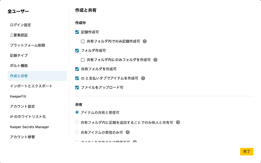 * **KA-5689**: Keeperの詳細な共有設定の強制により、管理者は記録の作成と共有に対する詳細な制限をユーザーロールに適用できるようになります。管理者は、ロール強制ポリシー内の「作成と共有」セクションで設定できます。