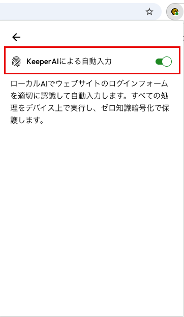KeeperAIによる自動入力を有効にするには、拡張機能の **\[設定]** に移動し、**\[KeeperAIによる自動入力]** を選択して、トグルをオンに切り替えてください。