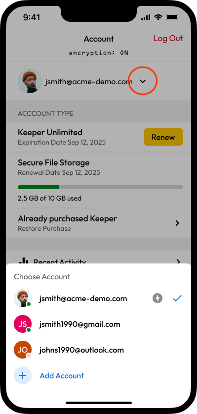 Keeperのログイン画面からも、アカウントの切り替えや追加を行うことができます。