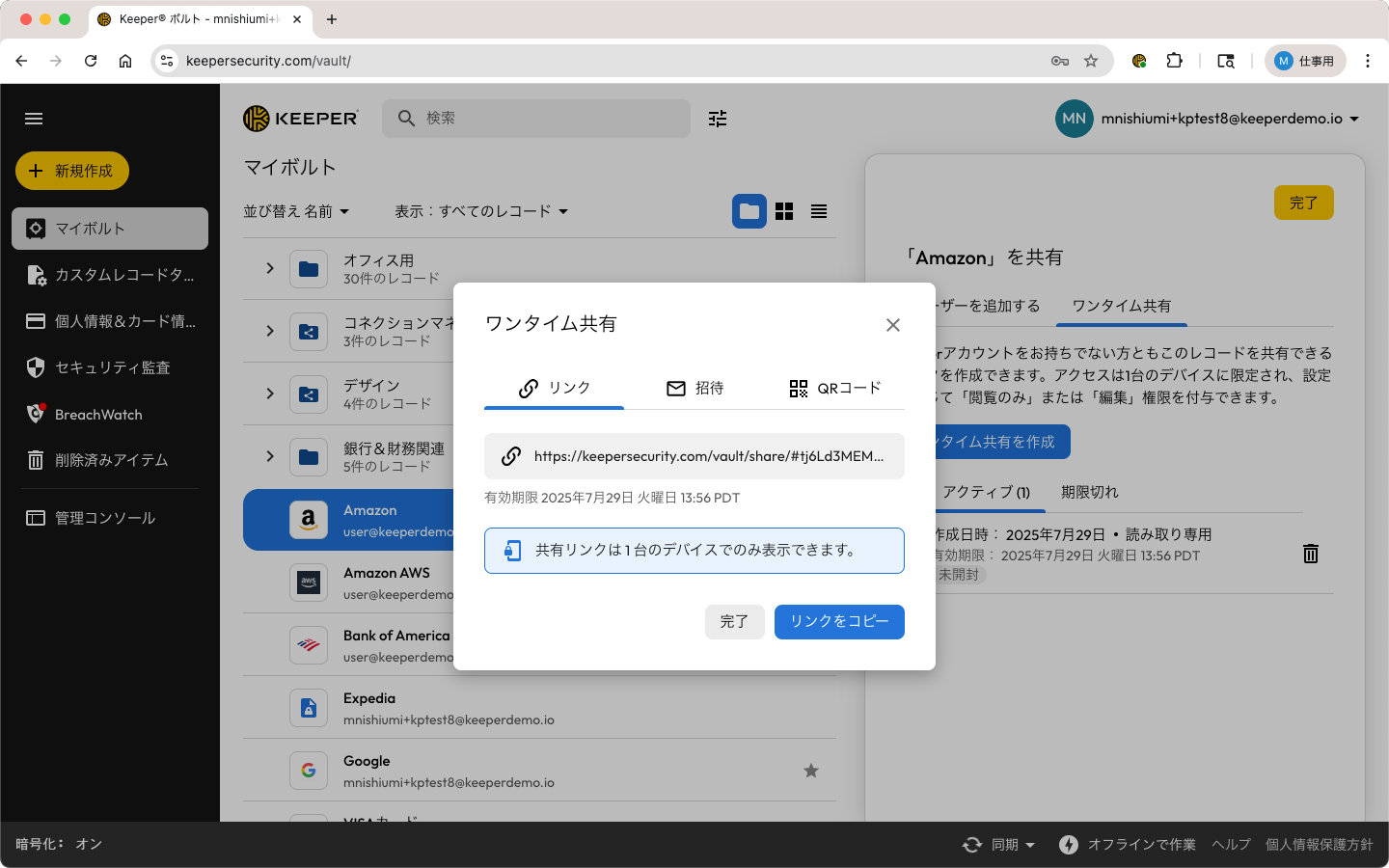 また、エンタープライズユーザーの場合は、Keeperの管理者によってワンタイム共有の使用が制限されている場合があります。