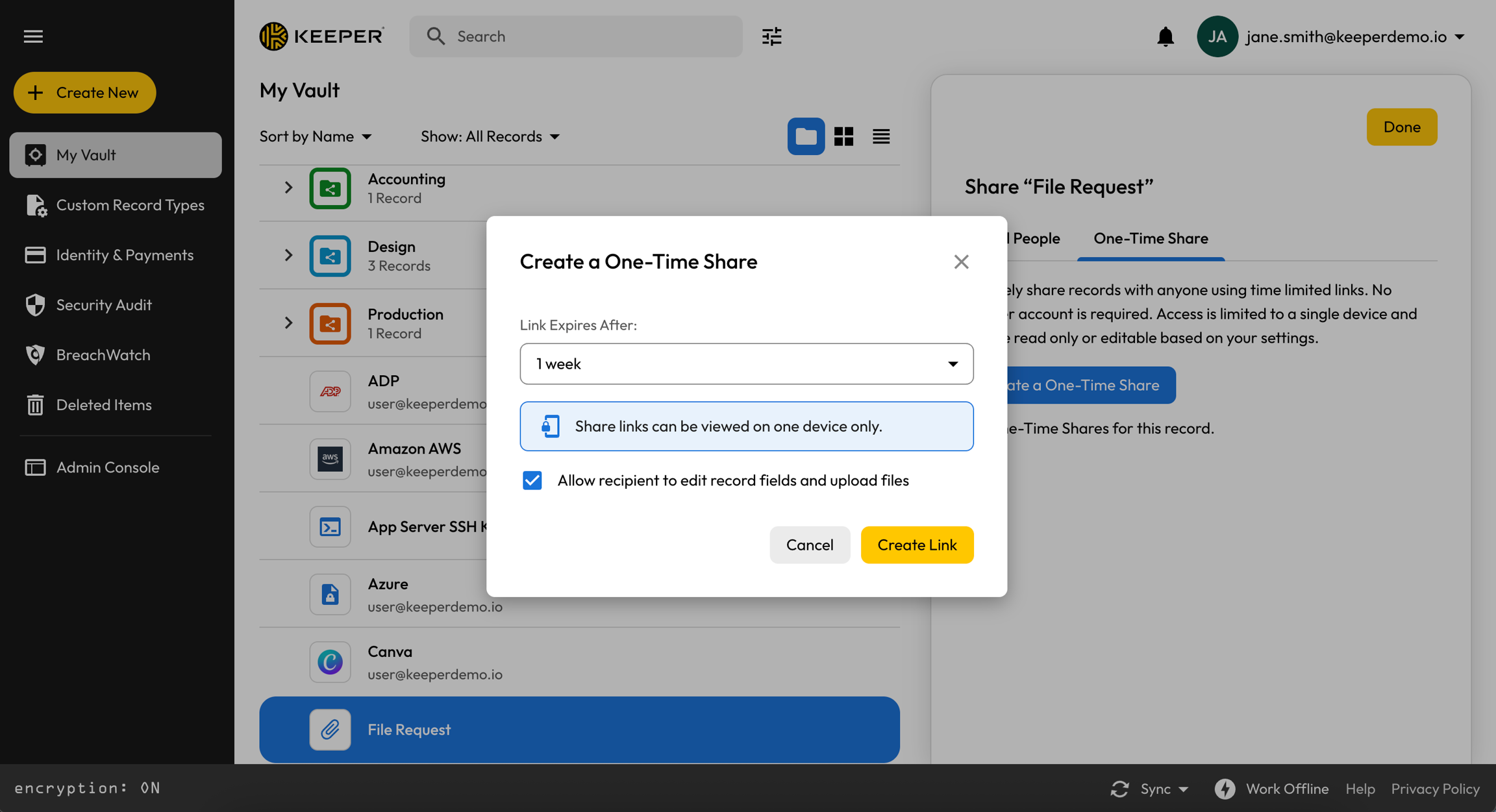 ワンタイム共有は、Keeperアカウントを持っていない人とも時間制限付きでレコードを安全に共有する機能です。ワンタイム共有を使用すると、Eメール、SMS、メッセージングアプリで情報をさらすことなく安全に機密情報を共有できます。