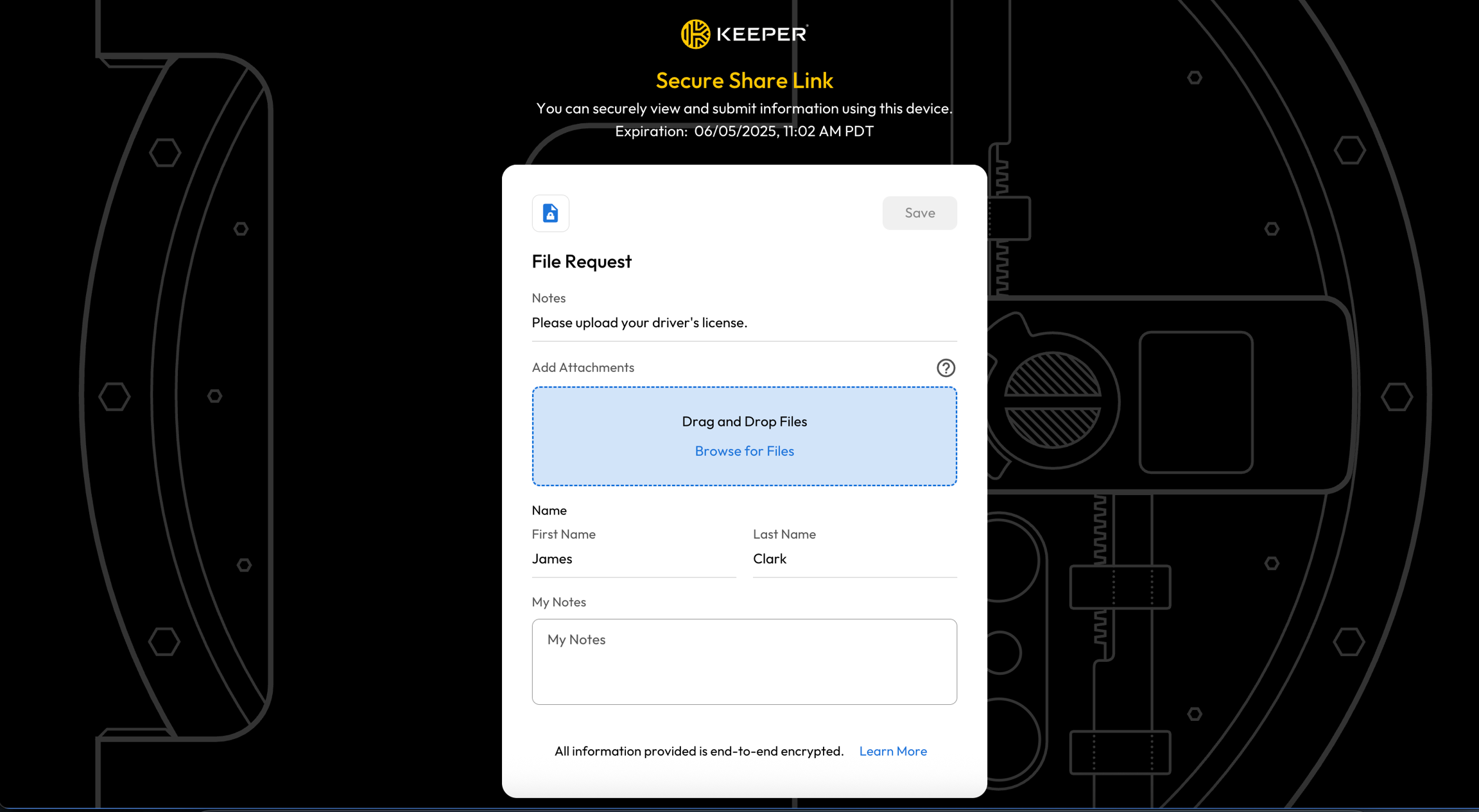この機能により、クライアント、契約業者、法務チームなどにKeeperアカウントを作成してもらう必要なく、署名済みの書類やフィードバック、機密ファイルの受け取りができるため、スムーズな連携が実現します。