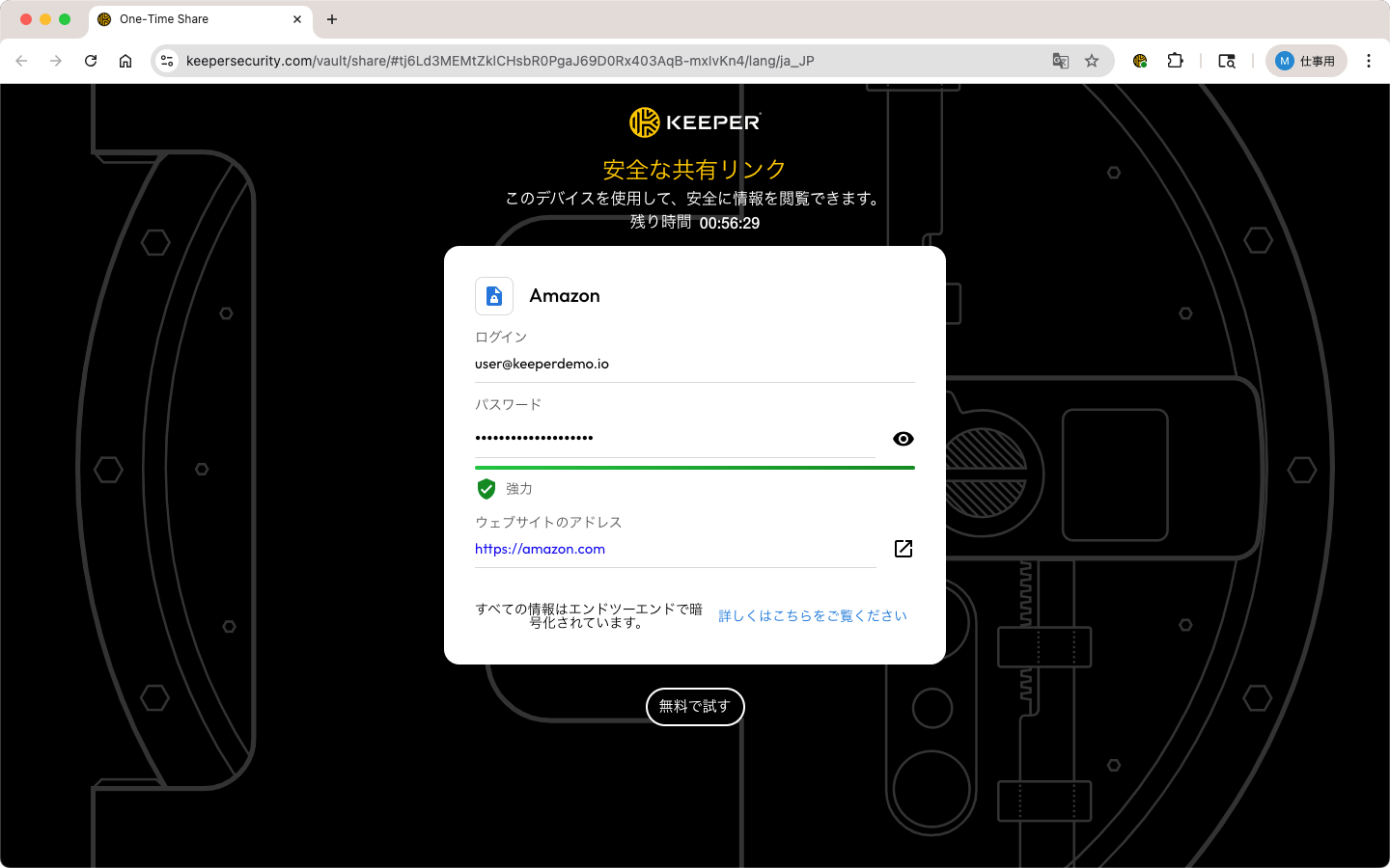 ワンタイム共有のセキュリティおよび使用されている暗号化モデルの詳細については、[セキュリティと暗号化に関するドキュメント](https://docs.keeper.io/enterprise-guide/keeper-encryption-model#wantaimumoderu)をご参照ください。