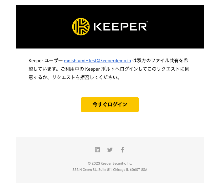 <figure><img src="https://2985347814-files.gitbook.io/~/files/v0/b/gitbook-x-prod.appspot.com/o/spaces%2F6Y1mjnoaNcCi93oXSTE3%2Fuploads%2Fgit-blob-152673fd8dc3fae805766321987ca97de6c0a130%2FKeeper%E3%81%AE%E5%85%B1%E6%9C%89%E8%A6%81%E6%B1%82%E3%83%A1%E3%83%BC%E3%83%AB.png?alt=media" alt=""><figcaption><p>Keeperの共有要求メール</p></figcaption></figure>