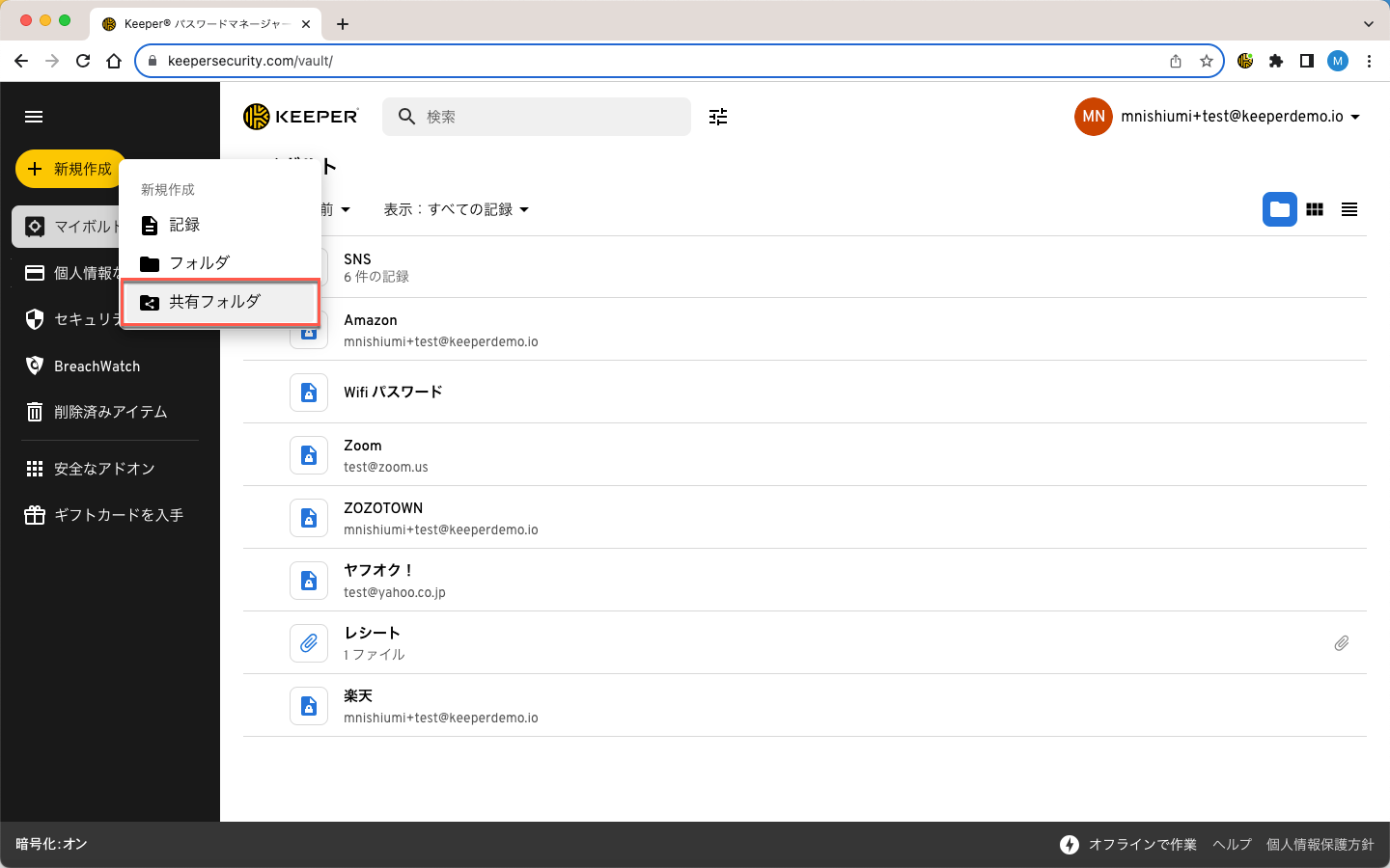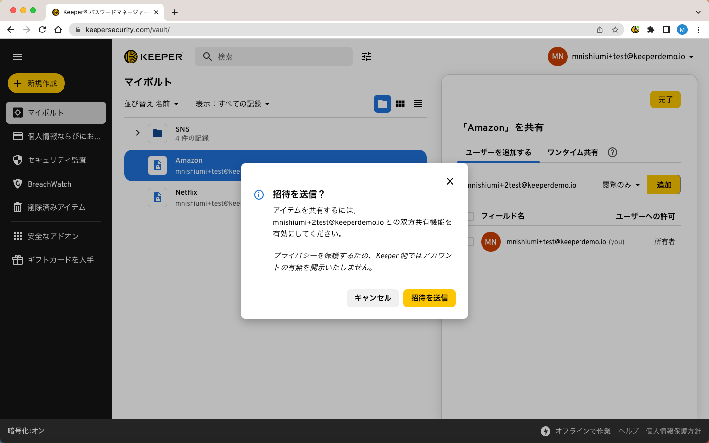 Keeperの他のユーザーとレコードやフォルダを一時的に共有できます。詳しくは[こちら](https://docs.keeper.io/jp/user-guides/kiakusesu)のページをご参照ください。