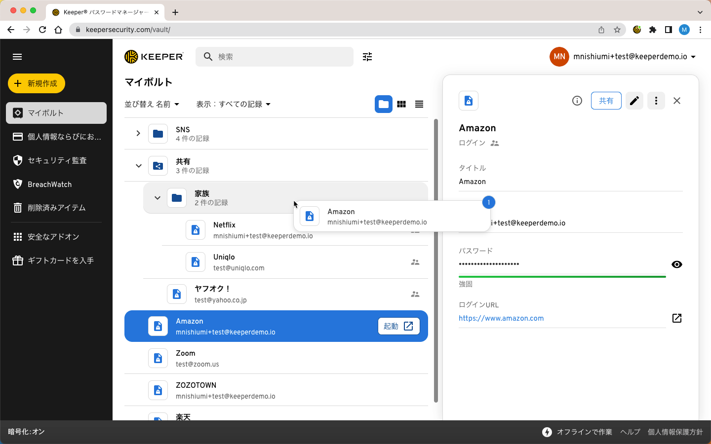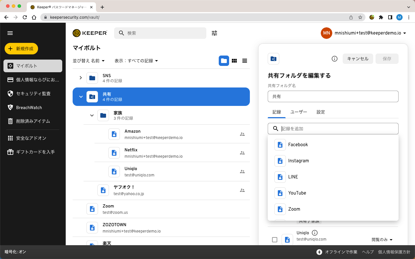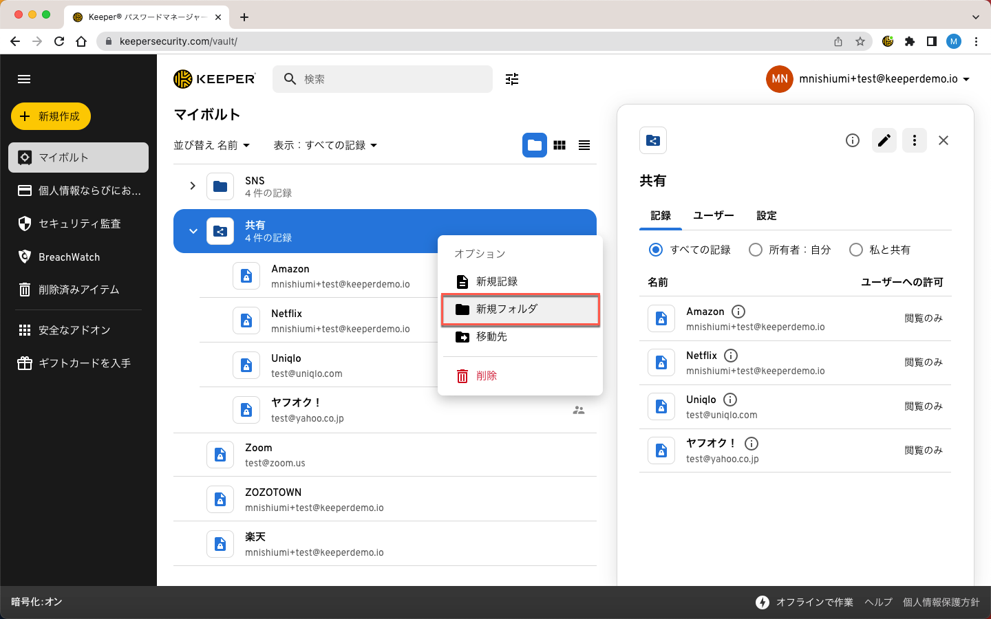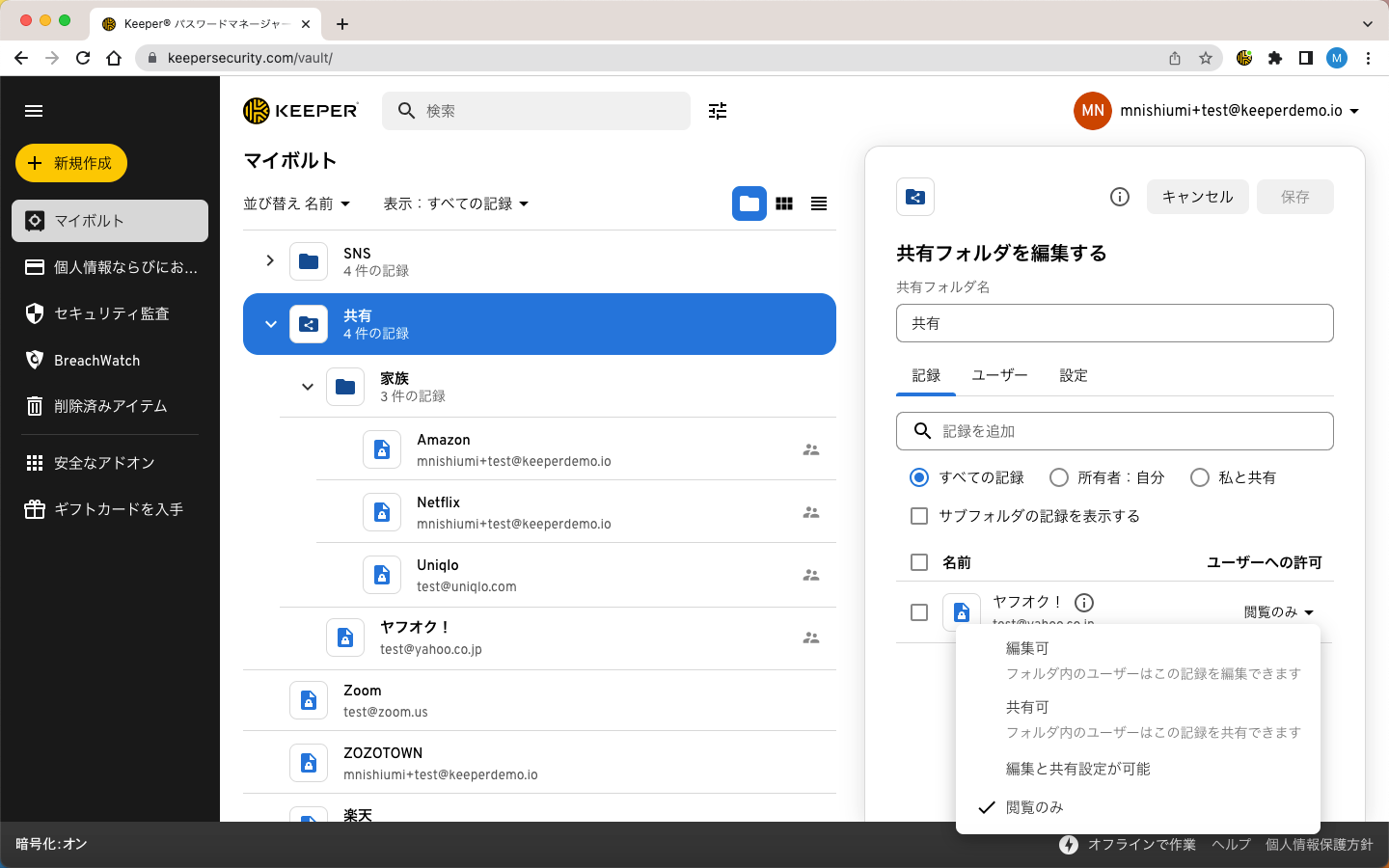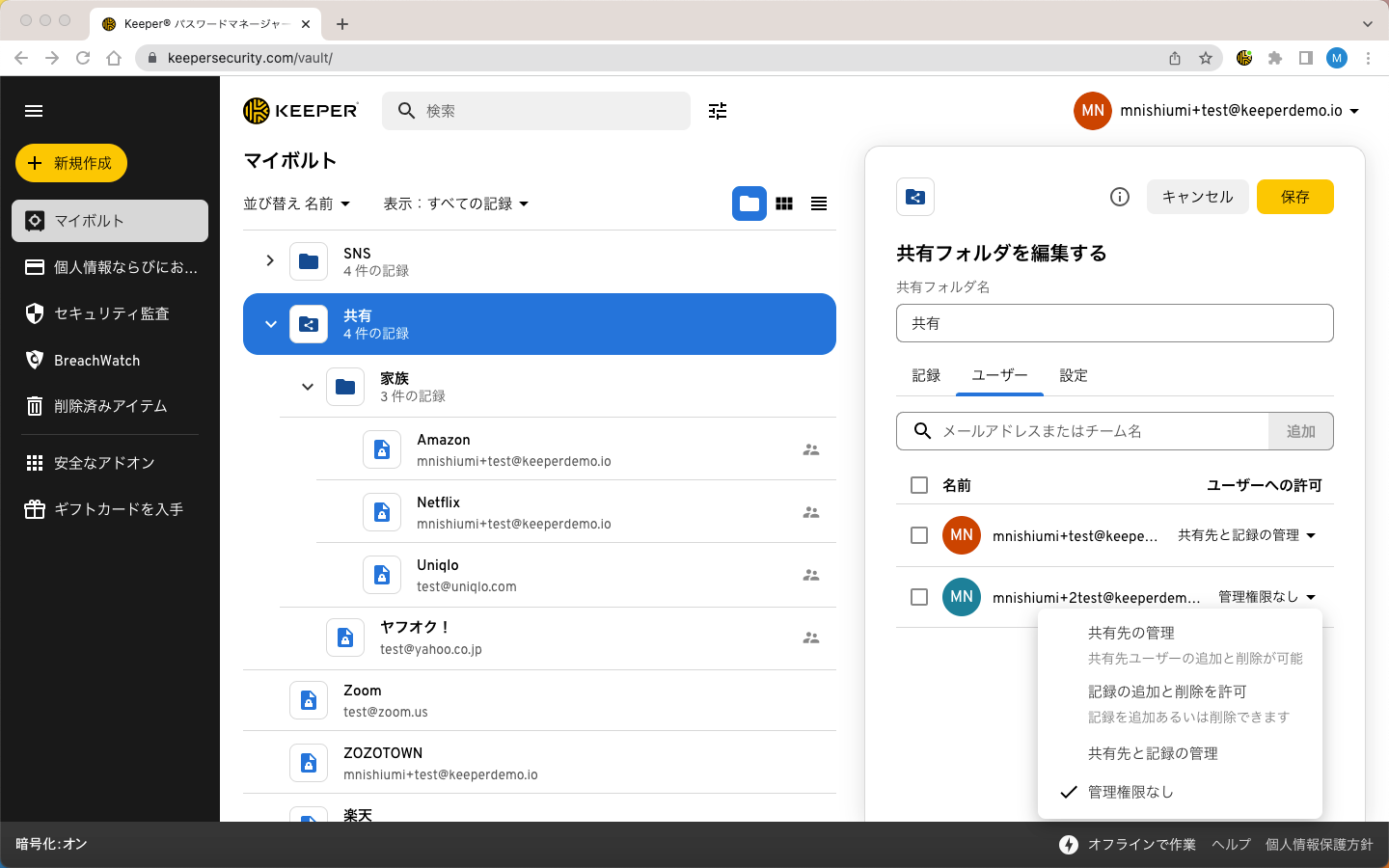 他のKeeperユーザーとフォルダを共有することで、一度に複数のレコードを共有できます。フォルダ内のレコードおよびユーザーを管理する権限を設定します。
