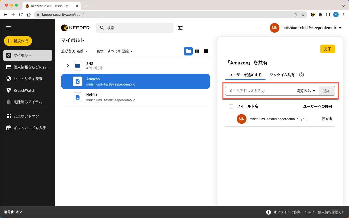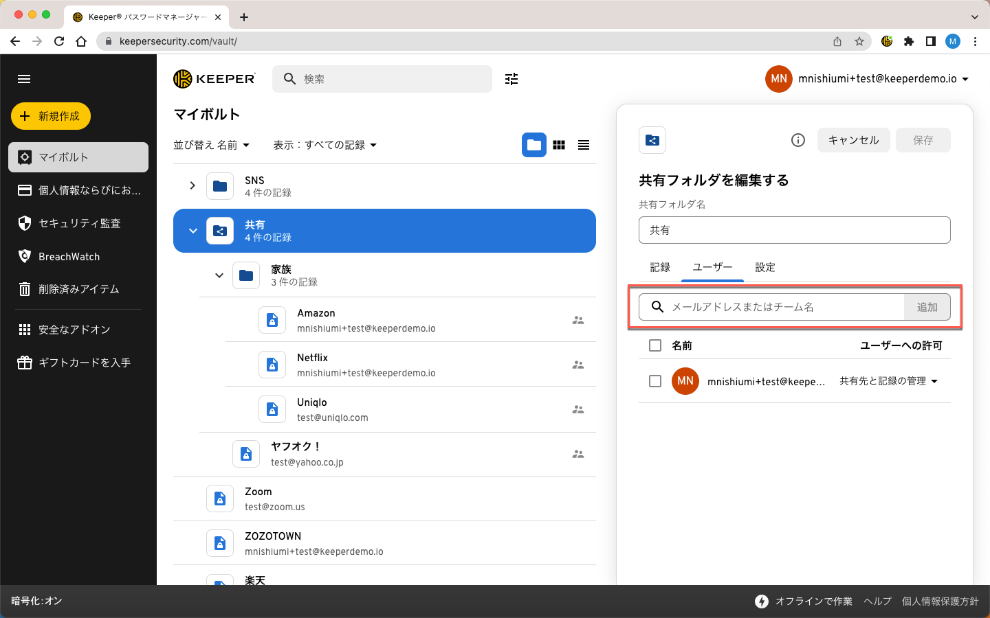 「ユーザー」 タブで、メールアドレスフィールド内をクリックし、共有フォルダを共有したいKeeperユーザーのメールアドレスを入力します。