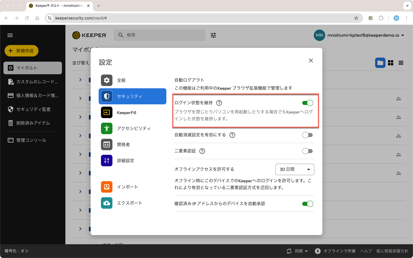 KeeperウェブボルトまたはKeeperデスクトップにサインインし、**アカウントのドロップダウンメニュー (右上のメールアドレスが表示されている箇所)** > **\[設定]** > **\[セキュリティ]**&#x306E;順にクリックし、\[ログイン状態を維持]をONにします。