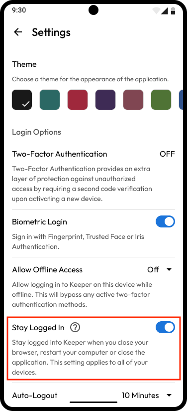 Android デバイスでログイン状態を維持機能を有効にするには、Keeperの設定メニューに移動し、「ログイン状態を維持」をオンに切り替えます。有効にすると、この設定はすべてのデバイスに適用されます。