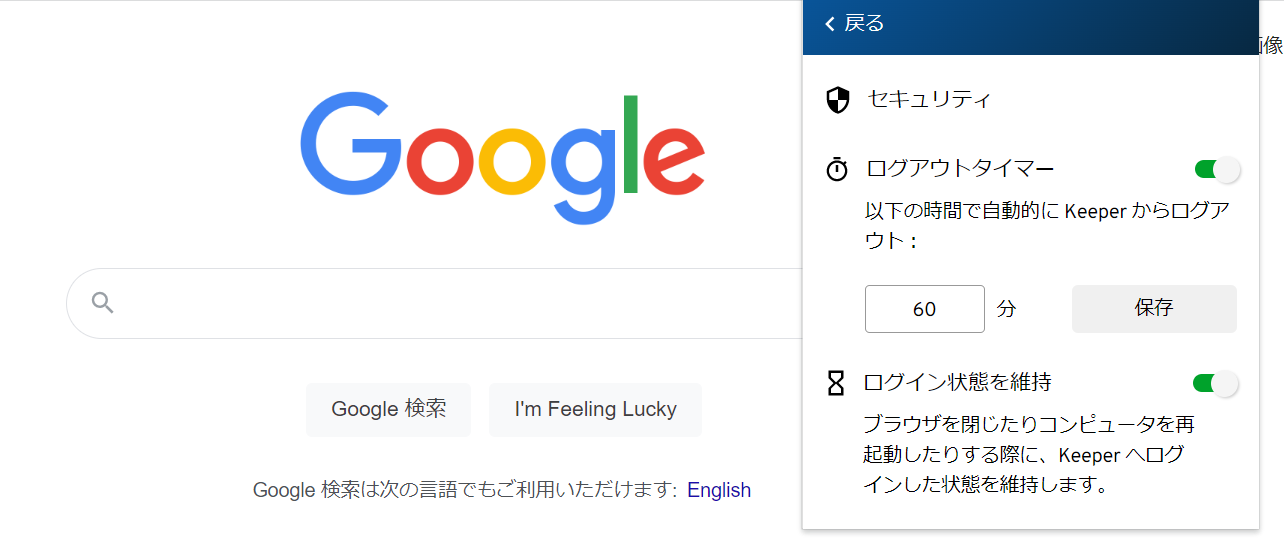 KeeperFillをダウンロードすると、KeeperFillのセキュリティ設定メニューから\[ログイン状態を維持]および\[ログアウトタイマー]の両方の機能を有効にできます。